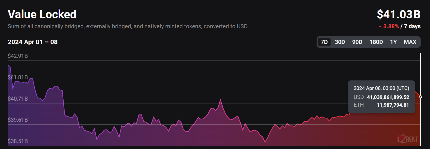 L2Beat’in 8 Nisan 2024, saat 02:00 UTC itibariyle en son verilerine göre; Base’in TVL’si 2,69 milyar $ yerel olarak basılmış değer, 3,69 milyon $ harici olarak köprülenmiş değer ve 1,45 milyar $ kanonik olarak köprülenmiş değerden oluşmaktadır. Dahası bu sadece son yedi gün içinde TVL’de yaklaşık %14’lük bir büyümeyi temsil ediyor.