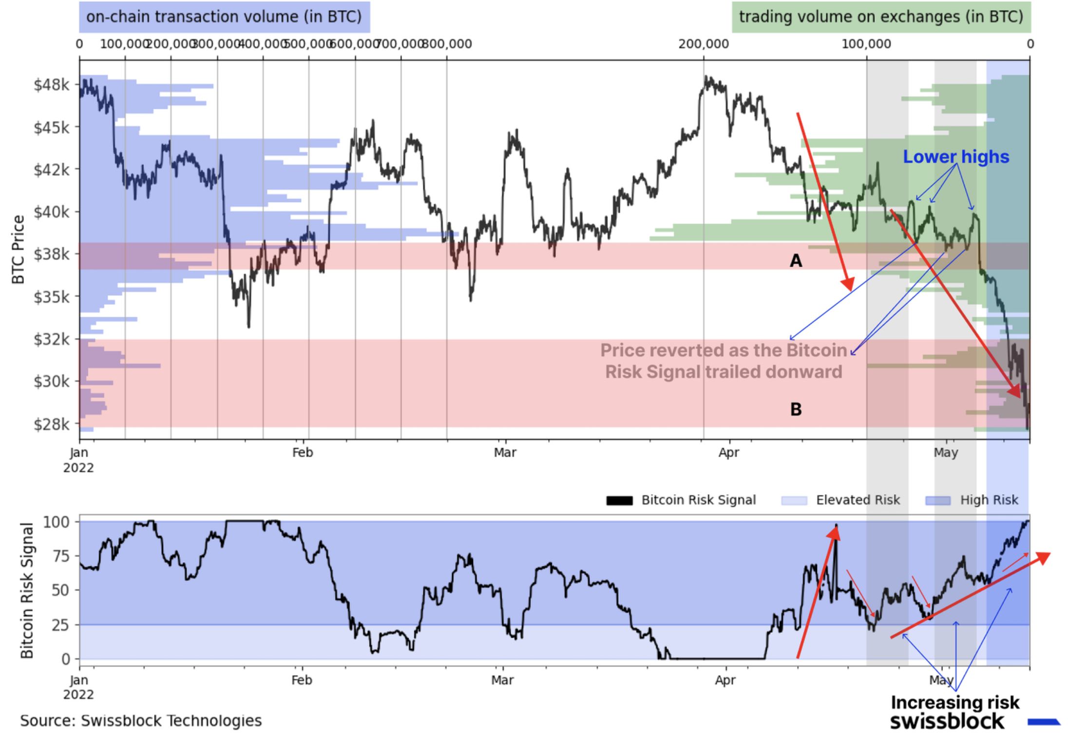 ABD Merkez Bankasının (FED) nakit akışını kısmaya hazır olması piyasaları sarsarken Bitcoin 30.000 doların altına geriledi. Üstelik Terra (LUNA coin) faciası ile beraber kripto para piyasaları kendi iç dinamkilerinden de zarar gördü. Veri analiz firması Swissblock, mevcut durum içerisinde “Bitcoin Risk Sinyalinin” aşırı uçlara (100) yaklaştığını bildiriyor.