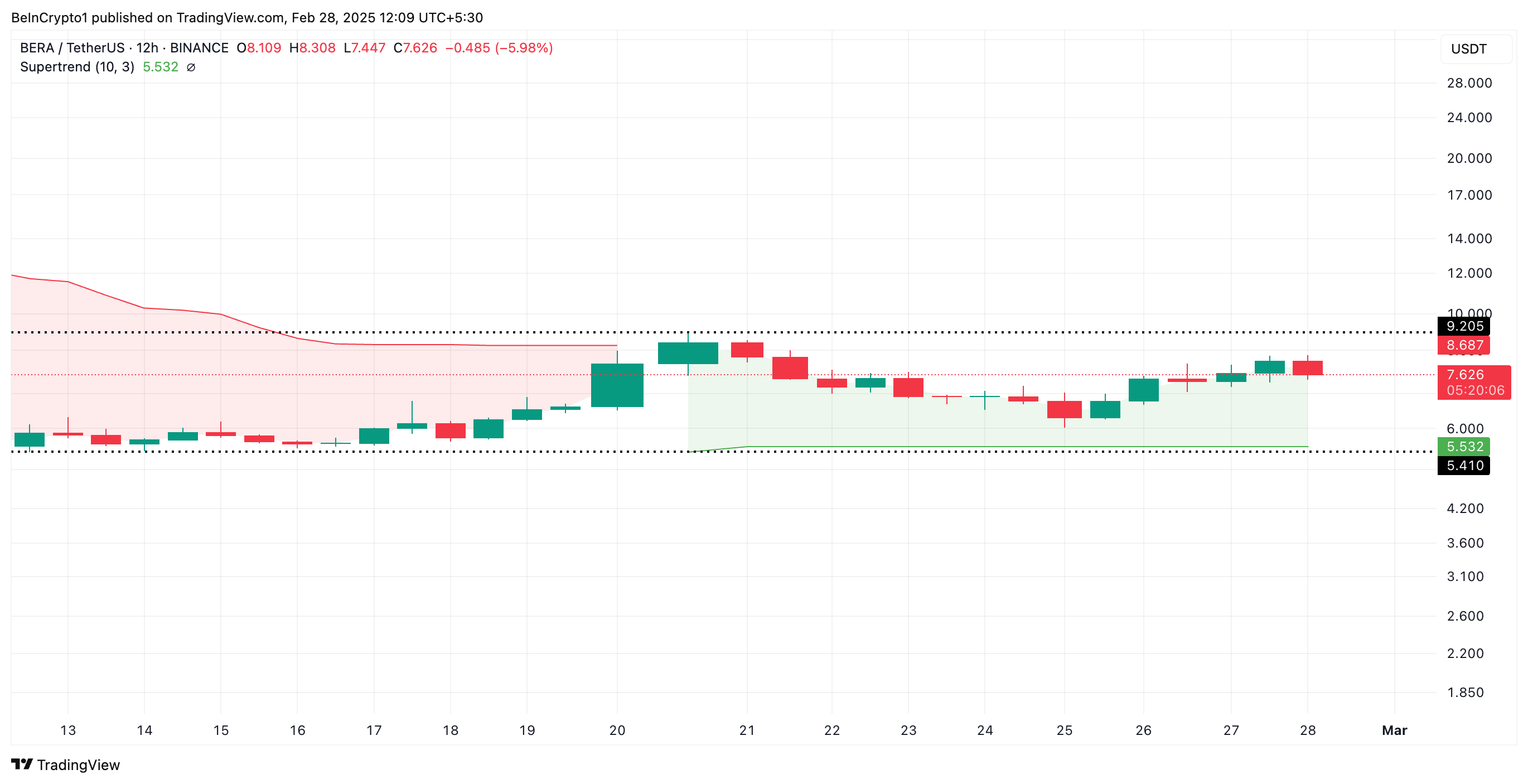 BERA’nın 12 saatlik grafikte değerlendirilen Super Trend göstergesi, piyasadaki yükseliş baskısını doğruluyor. 7,57 Dolar’dan işlem gören BERA, şu anda bu göstergenin sunduğu 5,53 Dolar dinamik desteğin üzerinde işlem görüyor.