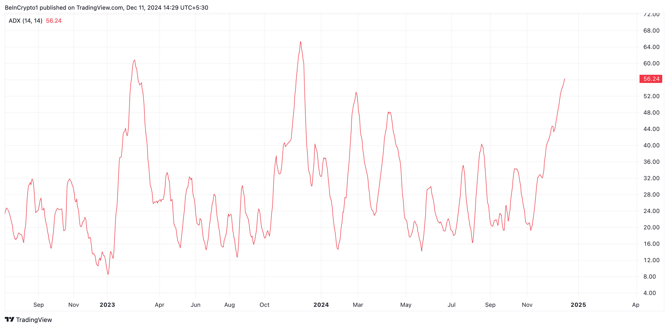 BGB’nin Ortalama Yön Endeksi (ADX), mevcut yükselişin güçlü olduğunu ve orta vadede devam edebileceğini doğruluyor. Yazı yazılırken, 56,24 seviyesinde ve yukarı yönlü bir trendde.