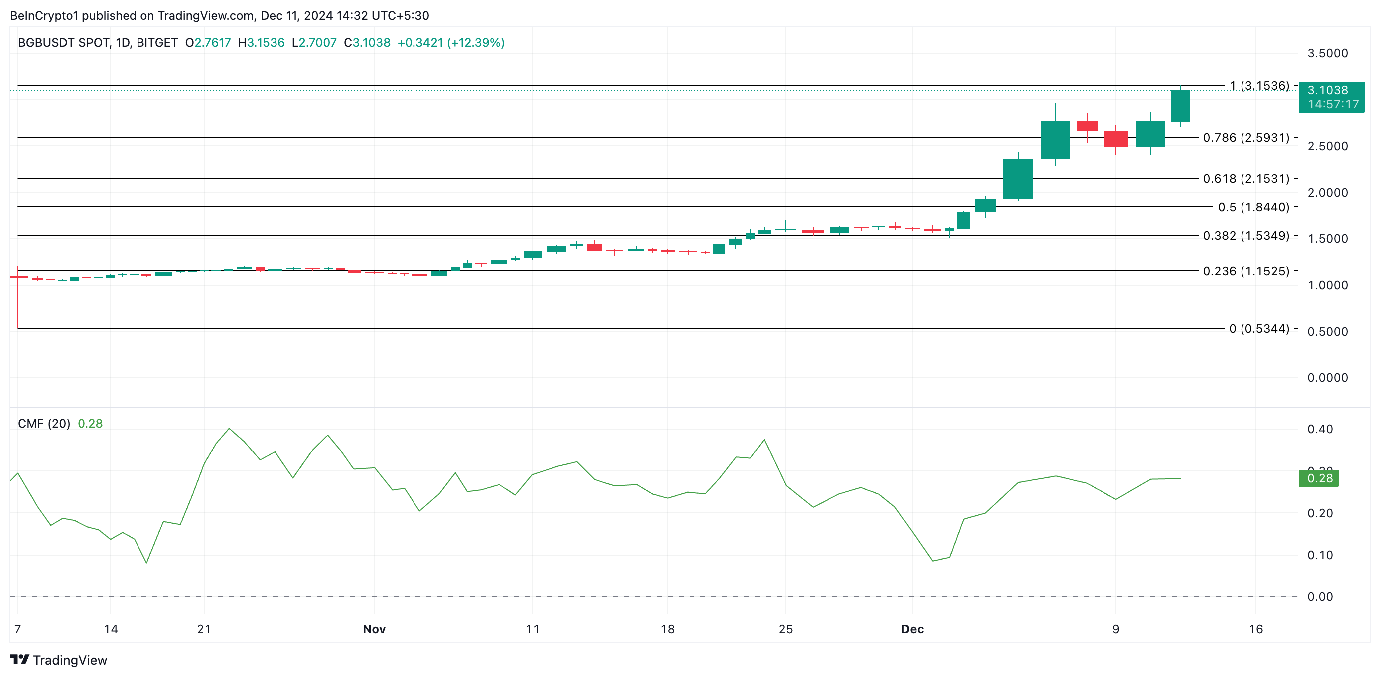 Günlük grafikte, BGB’nin Chaikin Para Akışı (CMF), token’a olan yüksek talebi yansıtıyor. Yazı yazılırken, gösterge sıfır çizgisinin üzerinde 0,28 seviyesinde yer alıyor.