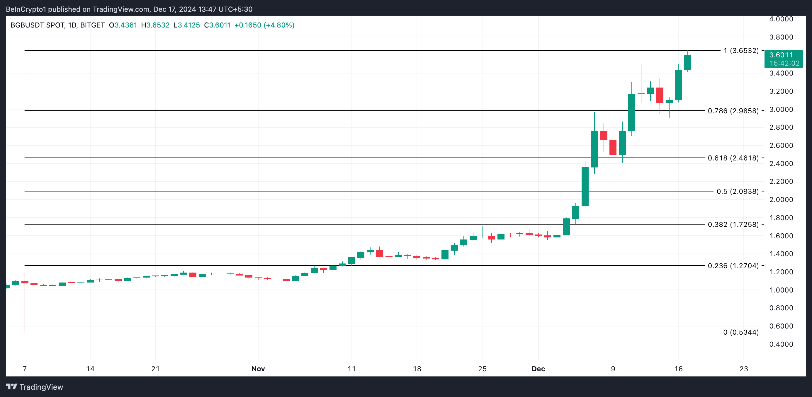 Bu yazı itibarıyla, BGB 3,60 dolar seviyesinde işlem görüyor ve yeni tüm zamanların en yüksek seviyesi olan 3,65 dolar tarafından oluşturulan direnç seviyesinin hemen altında. Sürekli alım baskısıyla, altcoin bu fiyat zirvesini geri kazanabilir ve 4 dolar bölgesine doğru yükselebilir.