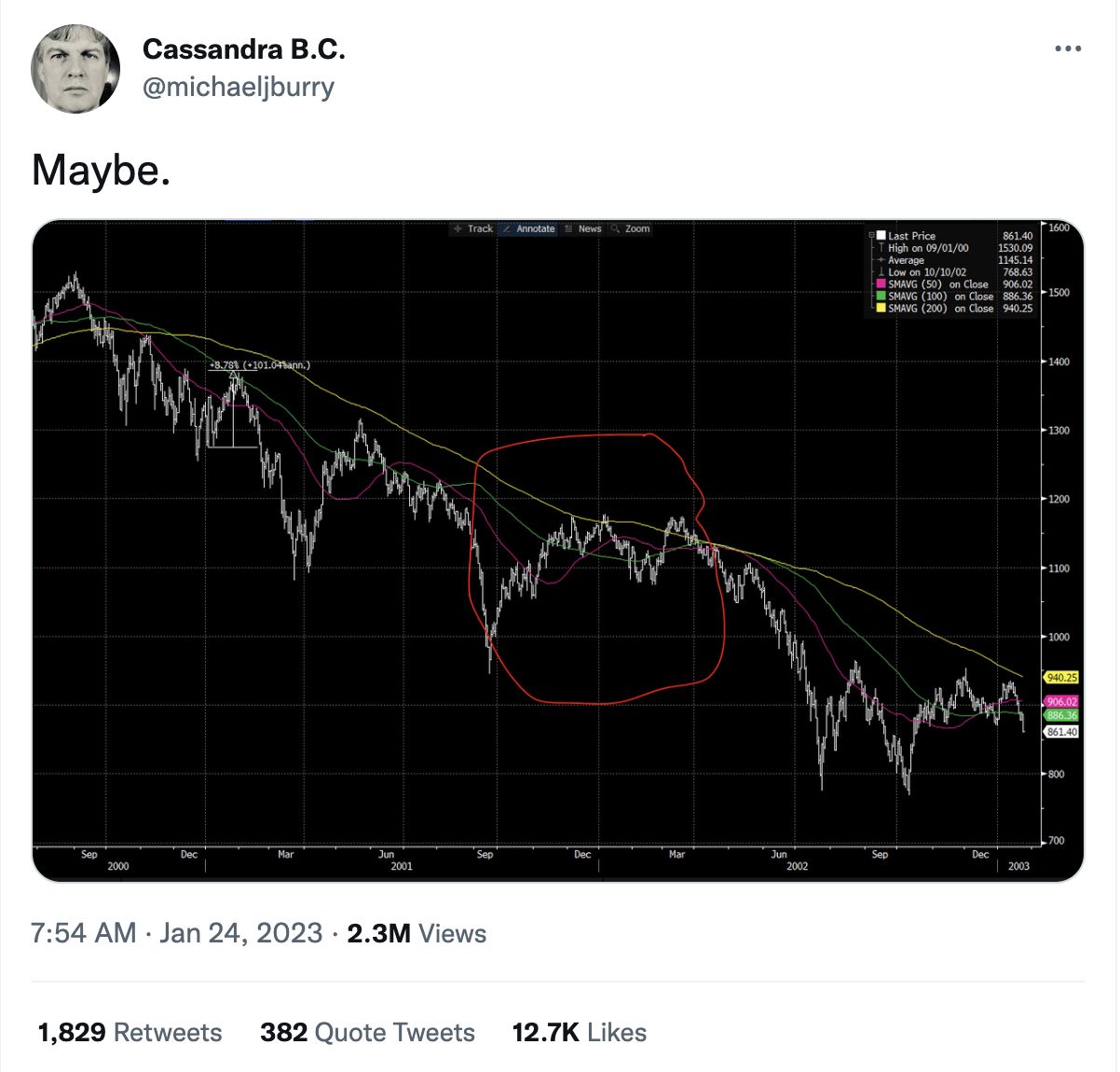 Milyar yatırımcı paylaştığı tweet ile S&P500 grafiğine dikkat çekti. Finans dehası olarak anılan Burry, piyasaların neredeyse 20 yıl önce tanık olduğu bir krize dikkat çekti. Burry, Dot-com balonu olarak anılan krizde görülen yükselişlere işaret etti. Ünlü milyarder, o dönem piyasanın iki kez yükseliş gösterdiğini ancak sonunda çöktüğünü hatırlattı. Burry’nin paylaşımı, kripto para ve riskli varlık piyasaları için yeni bir dip işareti olarak okunuyor.