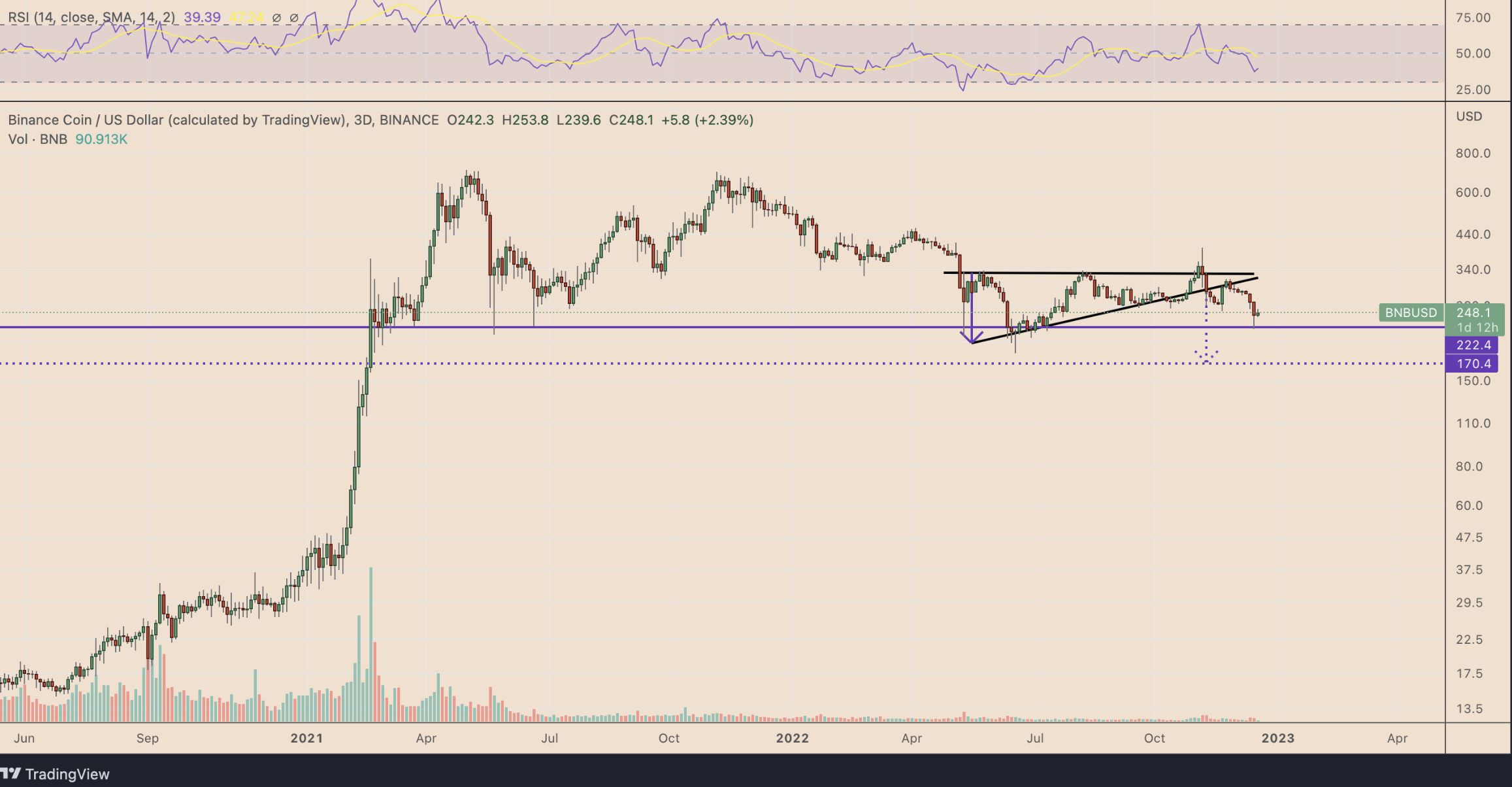“Teknik açıdan BNB, bir trend devam göstergesi olan çok aylı yükselen üçgen modelinin kırılma aşamasına girdi. Başka bir deyişle, BNB’nin yükselen üçgen düşüş hedefi, mevcut fiyat seviyelerinden yaklaşık %30 düşüşle 170 dolara yakın. BNB/USD paritesi, Ocak 2023’e kadar söz konusu seviyeye düşebilir. Şimdilik, BNB’nin çöküş hareketi, Terra’nın (LUNA) sıfırlanmasında tanık olunan ve güçlü bir destek seviyesi olarak hizmet eden 222 dolara yakın duruyor…”