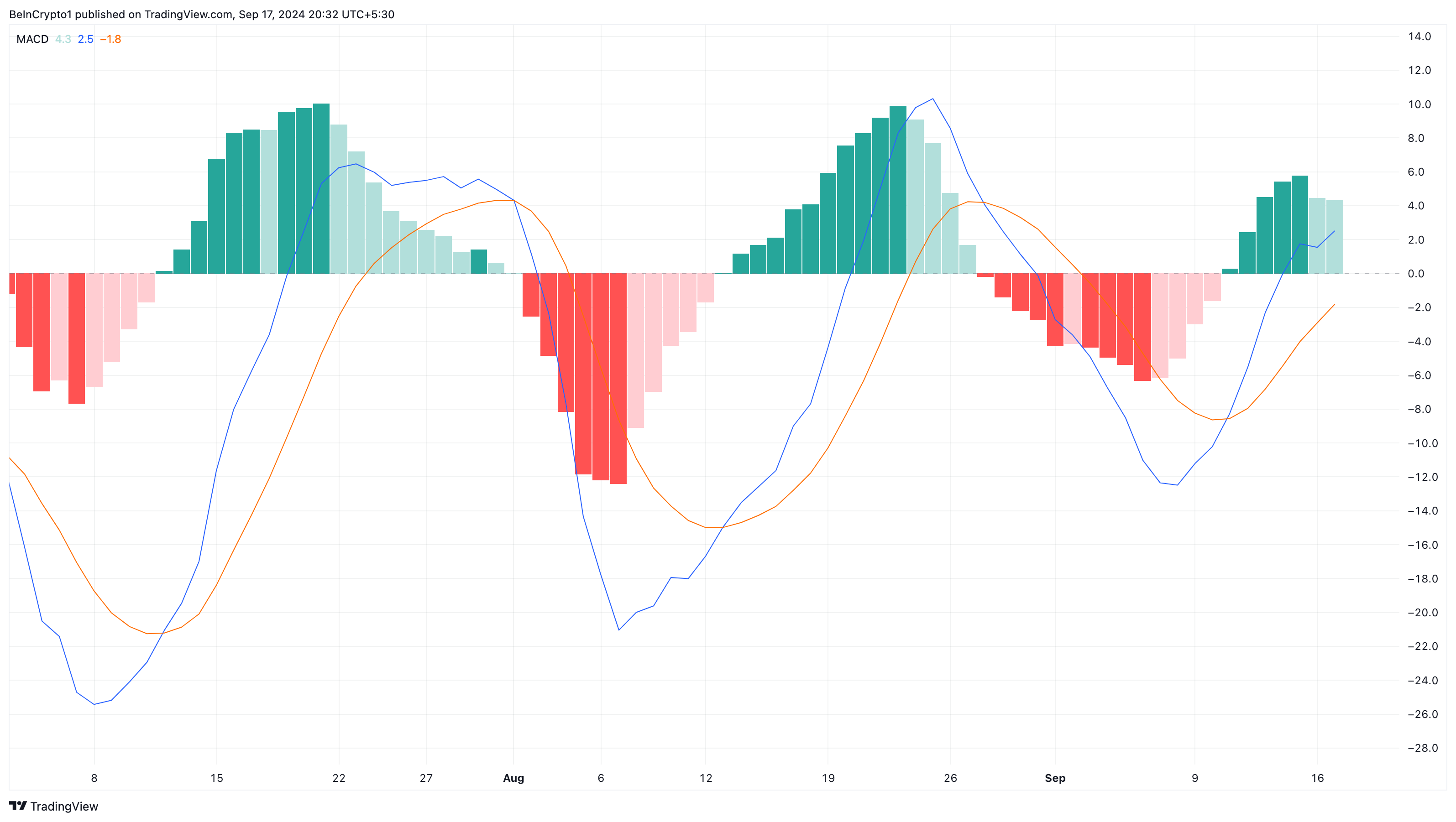 Günlük grafiğe dayanarak, Binance Coin’in (BNB) Hareketli Ortalama Yakınsama Iraksama (MACD) göstergesi şu anda pozitif bölgede. MACD, 12 günlük EMA (mavi) ile 26 günlük EMA (turuncu) arasındaki ilişkiyi değerlendirerek momentum ölçer. Ayrıca olası trend dönüşlerini belirler.