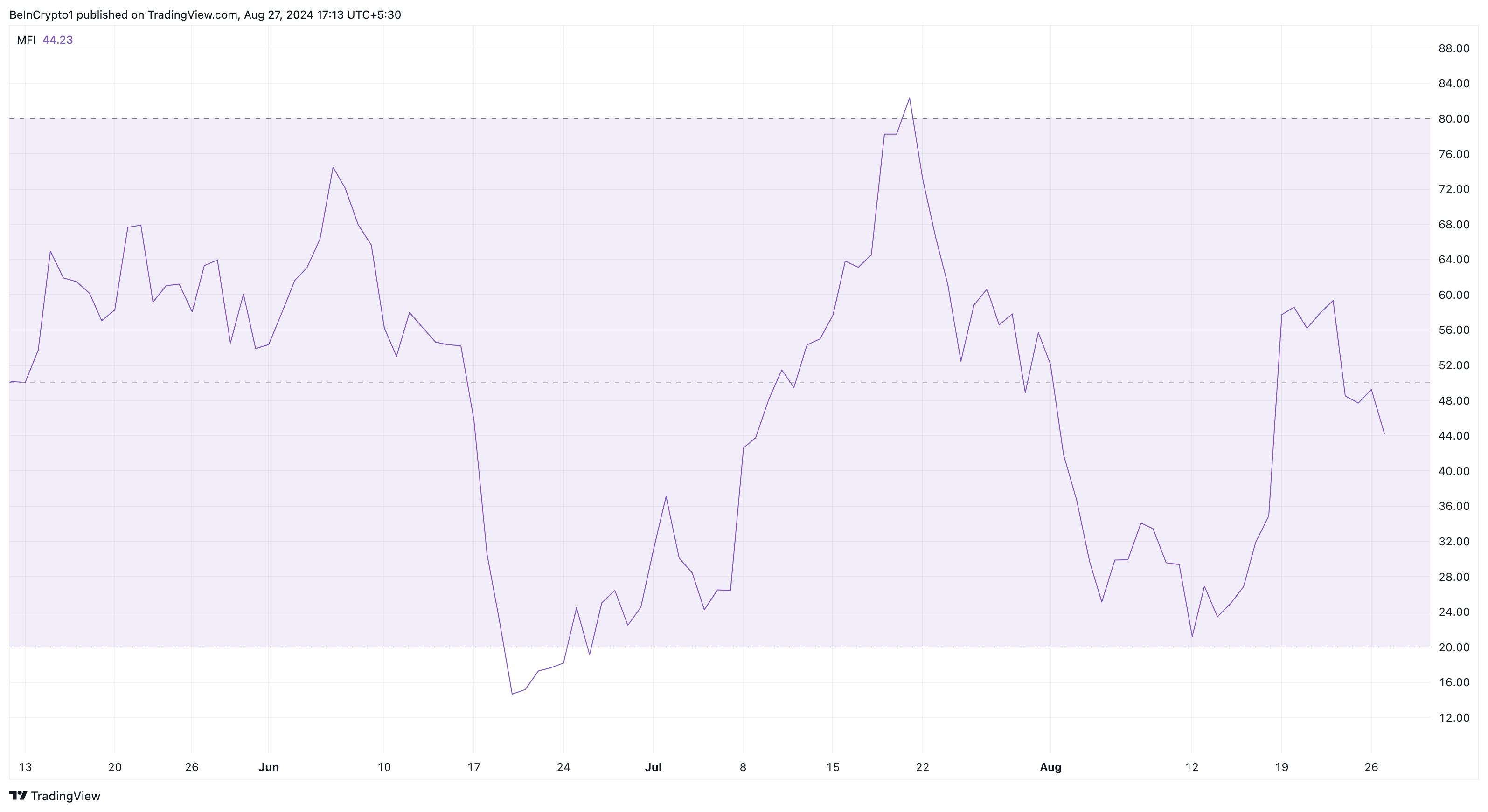 Ayrıca, Para Akışı Endeksi (MFI) ayısal görünümü pekiştiriyor. MFI, alım ve satım baskısını değerlendirmek için fiyat ve hacim verilerini izler. Artan bir MFI genellikle gelen sermayeyi ve olası bir fiyat artışını gösterirken, bir düşüş piyasadan paranın çıktığını ve ayısal bir trendi işaret eder.
