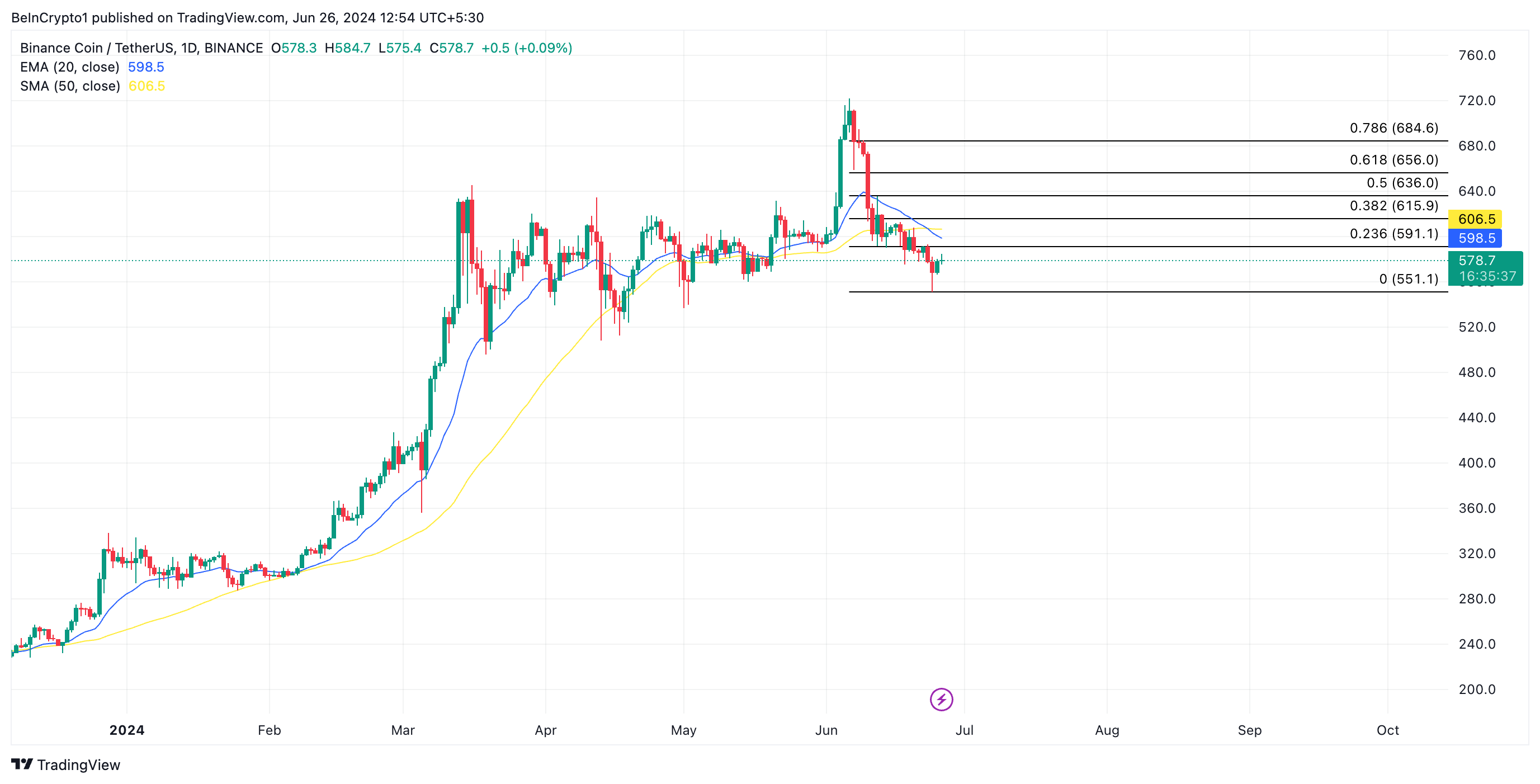 Binance Coin (BNB), 6 Haziran’da ulaştığı 720,67 dolarlık tüm zamanların en yüksek seviyesinden bu yana düşüş trendini sürdürüyor. Şu anda 576,22 dolardan işlem gören altcoin, %24’lük bir değer kaybı yaşadı.