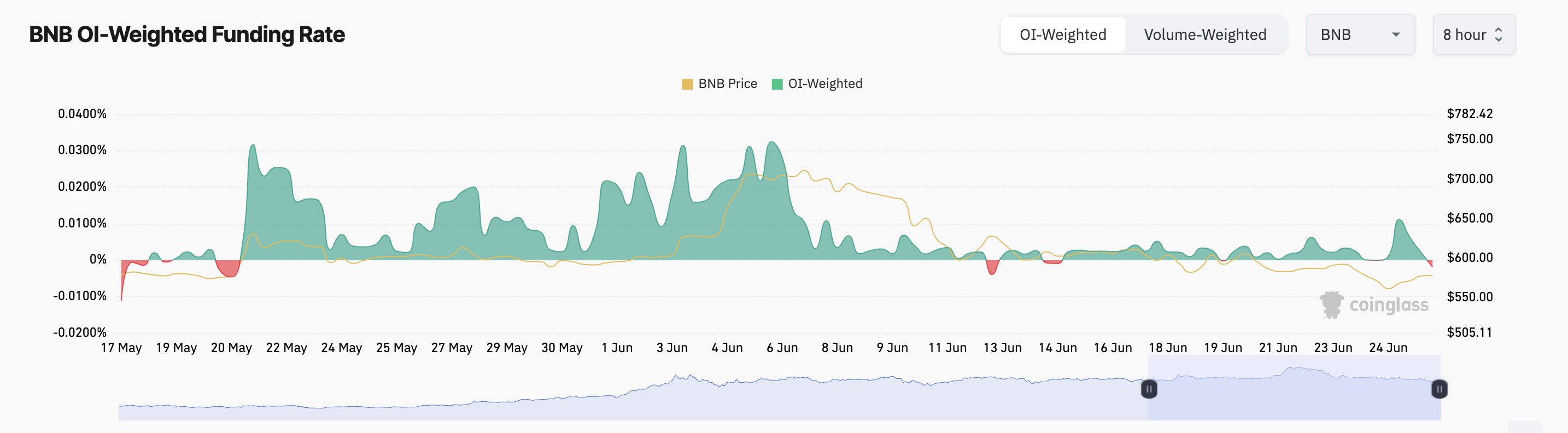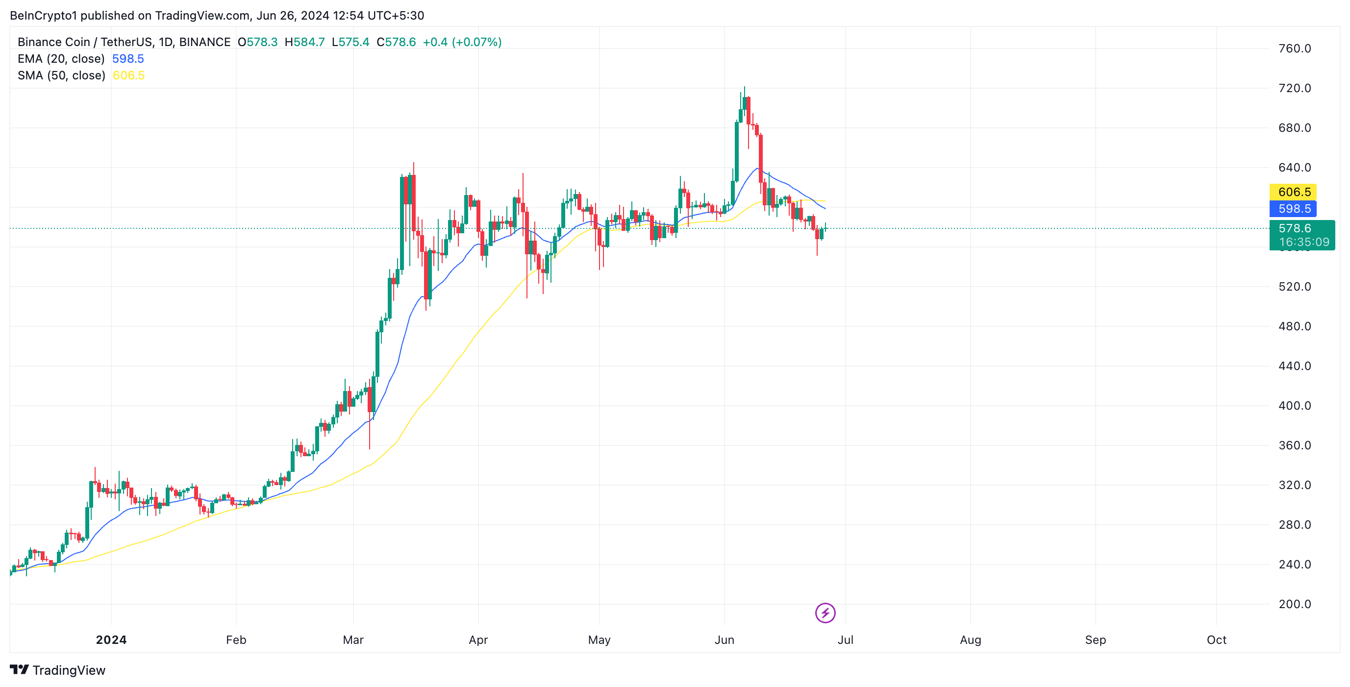 Bir varlığın fiyatı bu önemli hareketli ortalamaların altında işlem gördüğünde, bu düşüş sinyali olarak kabul edilir ve alım momentumunun azaldığını gösterir. BNB, 11 Haziran’da bu seviyelerin altına düştü ve o zamandan beri bu seviyelerin altında kaldı.