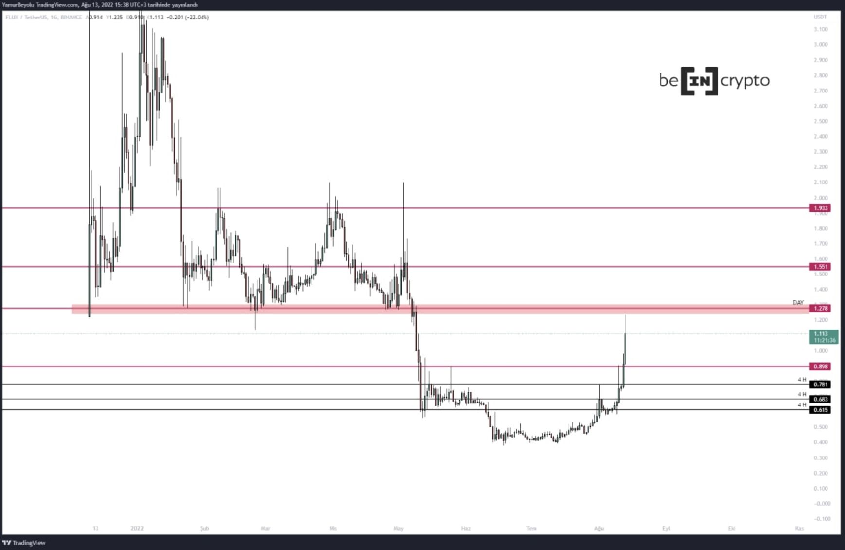 Binance borsasının son 24 saat içerisinde en çok yükselen altcoini %37’lik bir değer kazancı ile FLUX coin oluyor. FLUX 13 Temmuz’dan bu yana daha yüksek zirveler ve daha düşük dipler yaparak yukarı yönlü trendi sürdürüyor. BeInCrypto Türkiye analisti Yağmur Bayoğlu, hacimli yükselen FLUX için 0,89 dolar desteğinin korunması gerektiğine işaret ediyor: