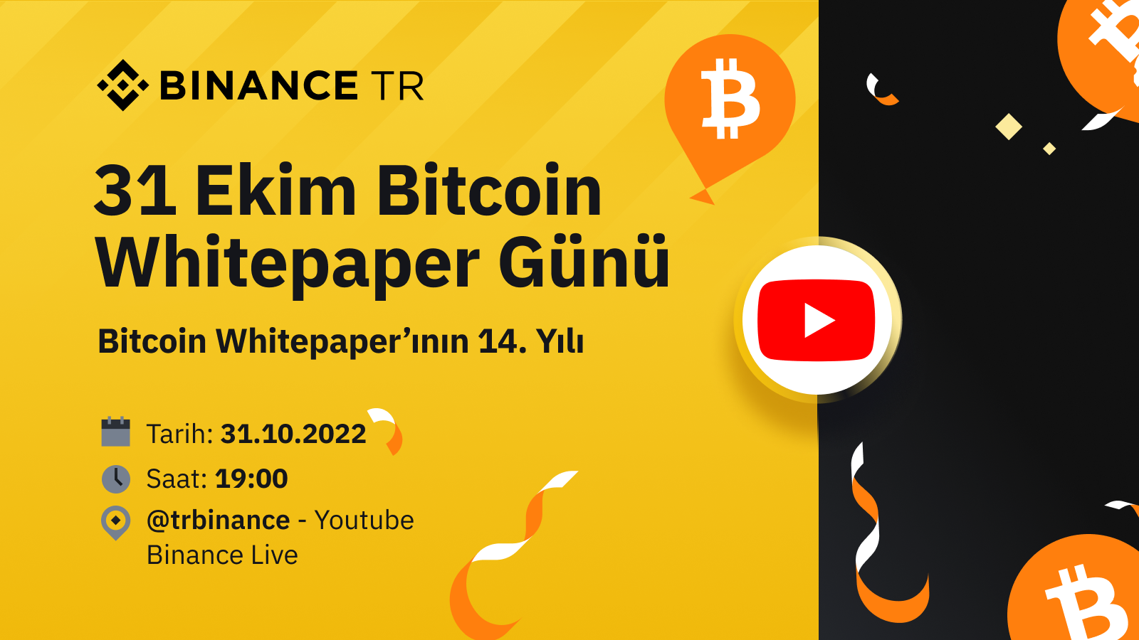 Dünyanın lider blok zincir ekosistemi ve kripto para altyapı sağlayıcısı Binance TR, 31 Ekim 2008’de Satoshi Nakamoto tarafından gönderilen bir elektronik posta ile ortaya çıkan “Bitcoin whitepaper”ın yıl dönümünü kutlamak için webinar düzenliyor.