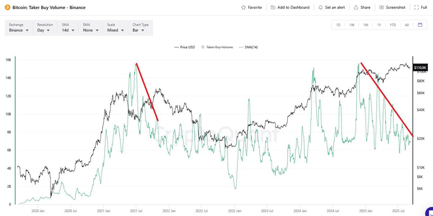 Grafikleri analiz ederken, 2020’den bu yana Bitcoin fiyat artışlarının büyük ölçüde Binance vadeli işlemler alım hacmindeki artışla örtüştüğünü görüyoruz. Ancak bu sefer durum farklı. Bitcoin fiyatı yeni tüm zamanların en yüksek seviyelerine ulaşsa da vadeli işlemler alım hacmi aynı hızda artmıyor. Mignolet, bu ayrışmanın 2021’deki piyasa zirvesine çok benzediğini belirtti.