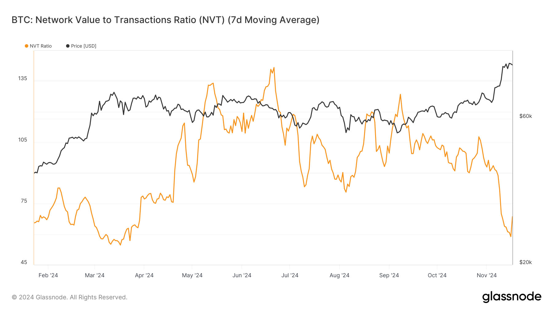NVT (Ağ Değeri ile İşlemler Oranı) Oranı, Bitcoin’in değerini analiz etmek için kritik bir metriktir. Son zamanlarda sekiz ayın en düşük seviyesine ulaştıktan sonra artış gösterdi. Düşük bir NVT oranı genellikle ağın işlem aktivitesinin değeriyle uyumlu olduğunu, dengeli ve sürdürülebilir bir piyasa sinyali verdiğini gösterir.