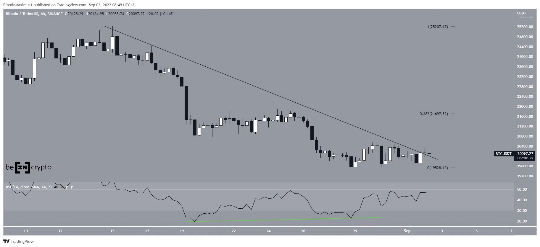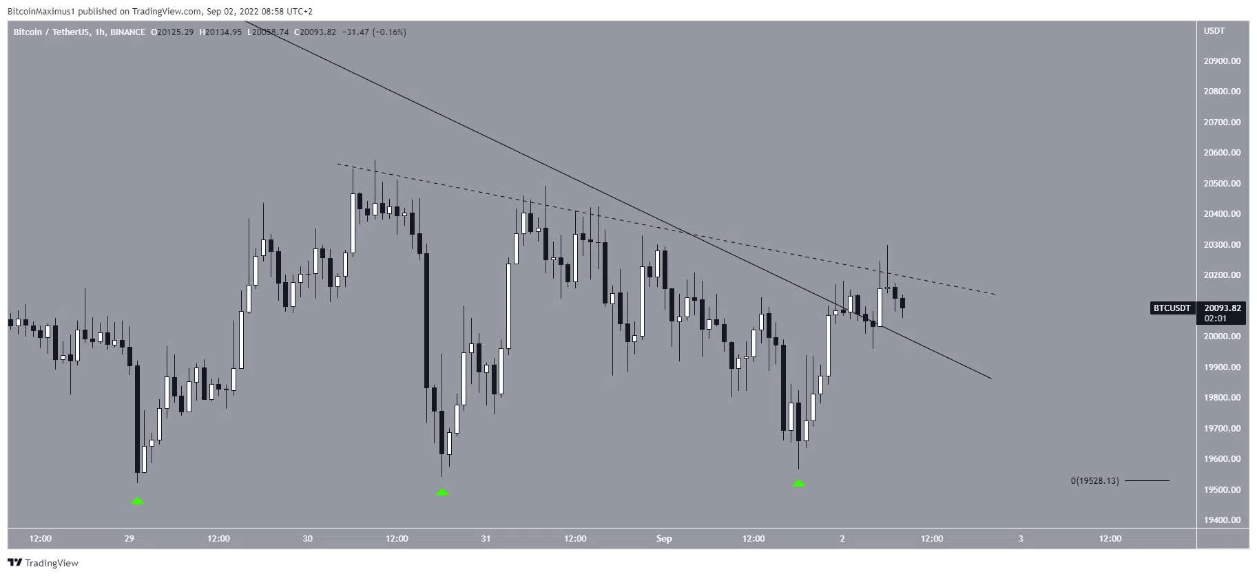 BTC fiyatı, 15 Ağustos’tan bu yana alçalan değer çizgisinin altında değer kaybediyordu. Fiyat, en sonuncusu 26 Ağustos’ta olmak üzere bu çizgiden birkaç kere red yedi. Bunun sonucunda 28 Ağustos’ta 19.520 dolara kadar geri çekilme yaşandı.