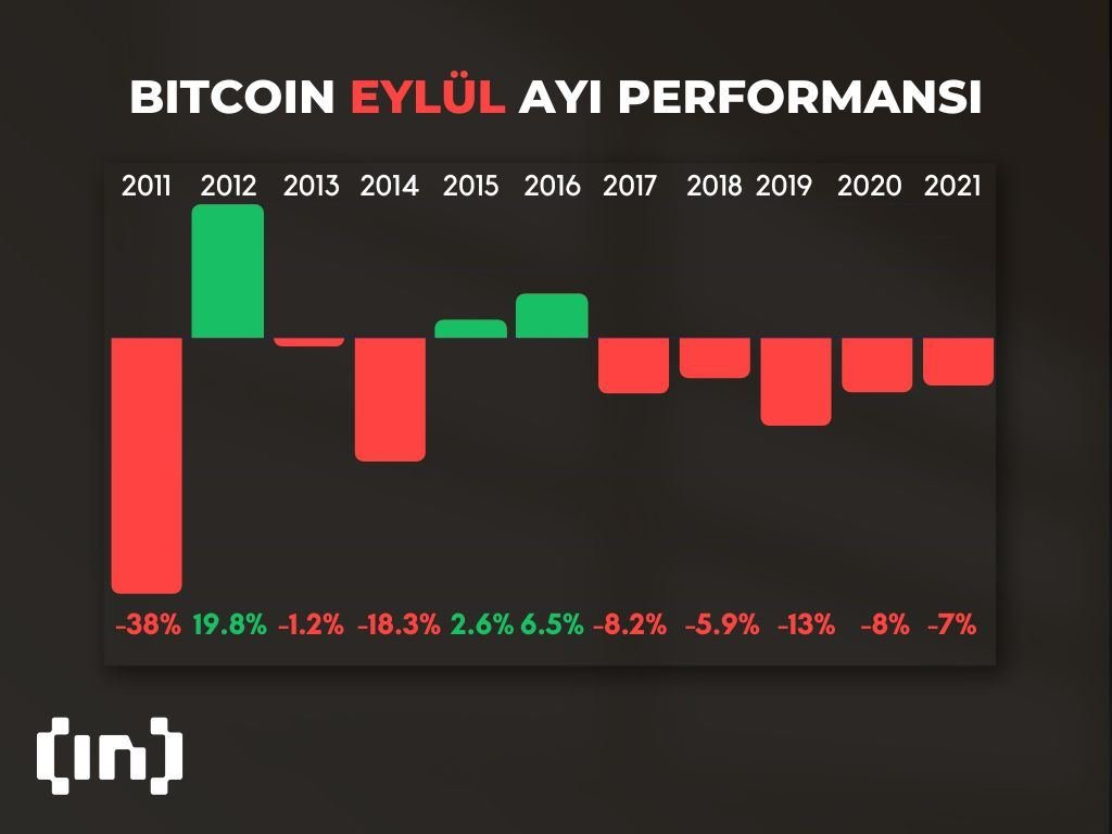 Tarihte eylül ayları, lider kripto para için olumsuz geçti. 2020 ve 2021 yılının Eylül aylarında, Bitcoin fiyatı yüzde 7’den fazla değer kaybetti. 2012 yılının Eylül ayı yüzde 19,8 artışla kapanırken, 2011’de yaşanan yüzde 38’lük düşüş ise dikkat çekti.