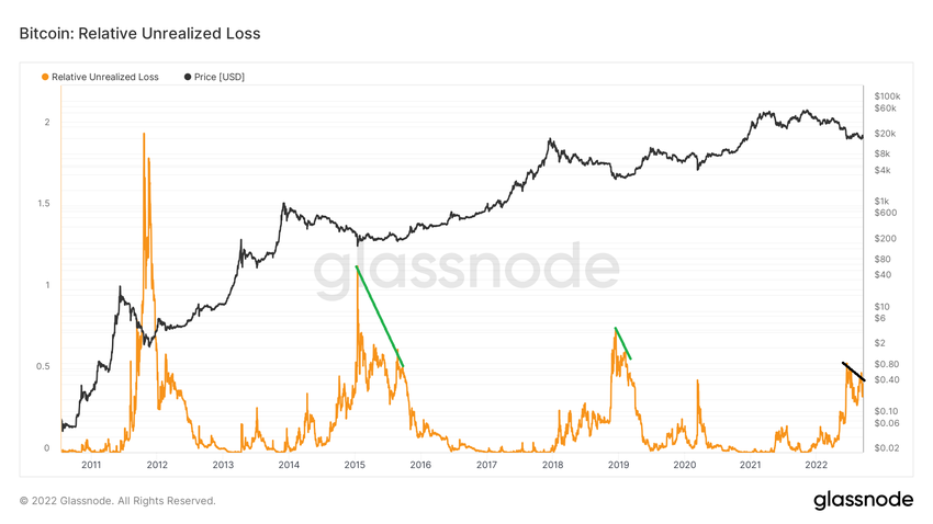 Trendin yönü konusunda bize ışık tutabilecek bir indikatör ise “Görece Realize Edilmemiş Zarar” indikatörü. Bu gösterge, son hareket ettikleri anda fiyatı mevcut fiyattan daha yüksek olan mevcut tüm coinlerlin toplam zararını ölçer. Daha sonra, gösterge piyasa değeri ile normalleştirilir.