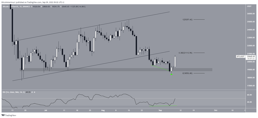 BTC, 7 Eylül’de 19.000 dolar yatay destek bölgesinden sıçrama gösterdikten sonra yükselişe geçti. Bu yükseliş hareketinden önce günlük RSI da pozitif uyumsuzluk (yeşil çizgi) ortaya çıktı.