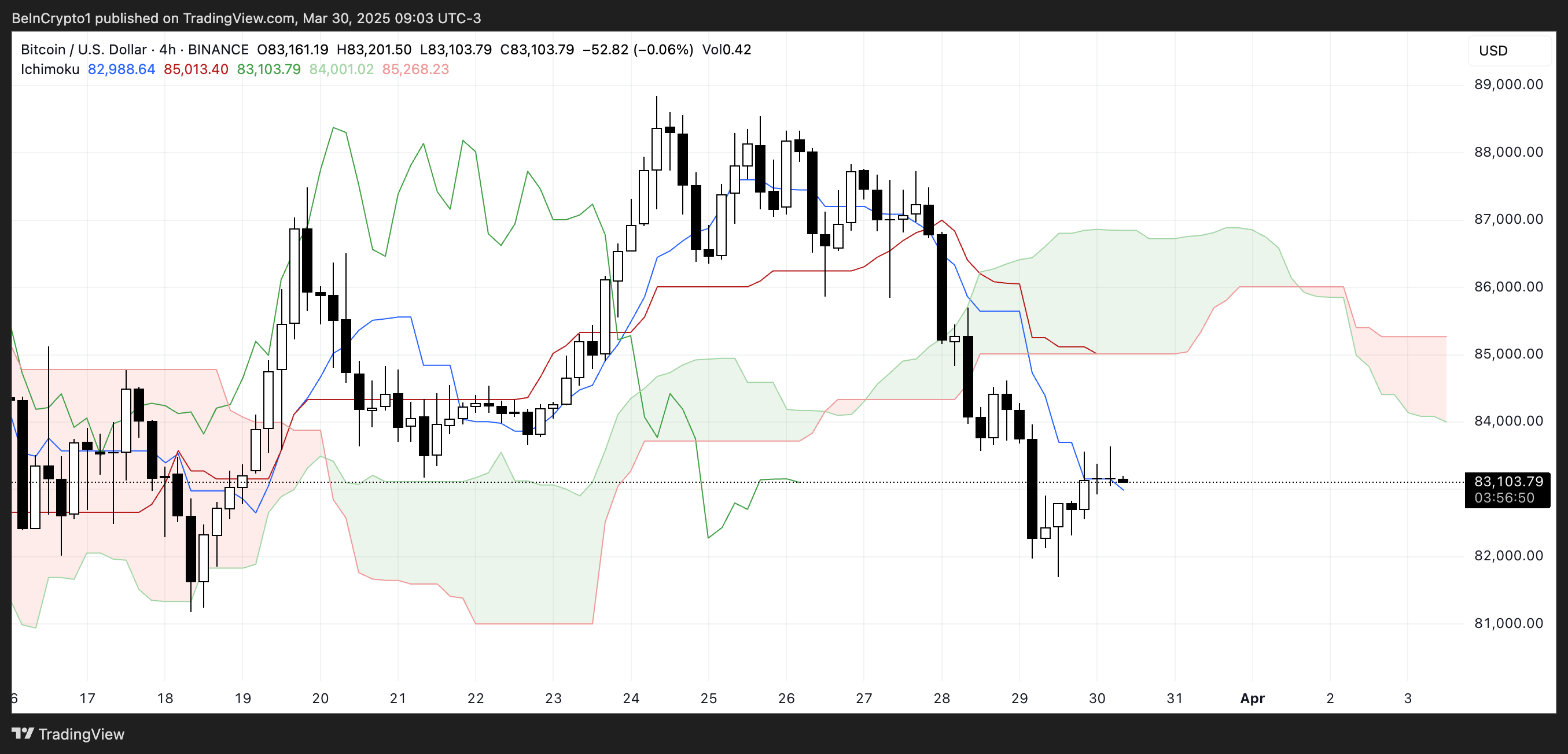 Bitcoin için Ichimoku Cloud grafiği, fiyatın güçlü bir aşağı hareketin ardından Kijun-sen (kırmızı çizgi) hemen altında konsolide olduğunu gösteriyor.