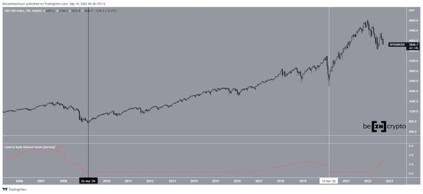 Bu durumlar, 2009 (siyah) ve 2020’de (beyaz) açıkça görülebilir. Faiz oranları (kırmızı), Bitcoin’in yüksek korelasyona sahip olduğu S&P 500 dip sonunda dip seviyeye ulaşmadan sonra bir yıldır düşüş gösteriyordu. Bu yüzden, FED hâlâ faiz artırdığı için S&P 500’ün dip seviyeye daha ulaşmadığını söylemek mümkün.