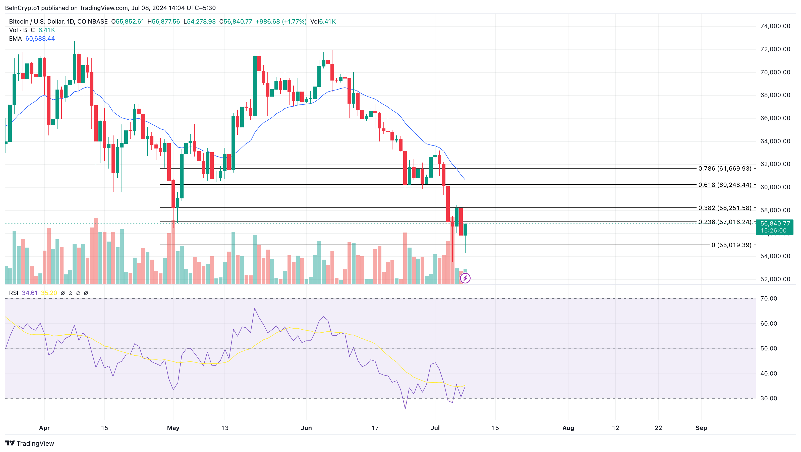 Fibonacci Düzeltmelerinin konumlarına göre, BTC 57.016 doları kırarsa 58.251 doları yeniden test edebilir.
