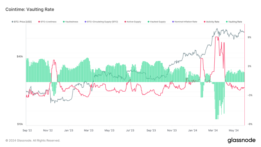 Vaulting Rate, kullanıcıların ne kadar Bitcoin kullanıcısının uzun vadeli depolamaya geçtiğini gösterir ve bu da onu gelecek için güvende tutar (Vaulted Supply, kasaya alınan veya ilk satın alınmasından bu yana hiç satılmayan Bitcoin yüzdesini temsil eder).