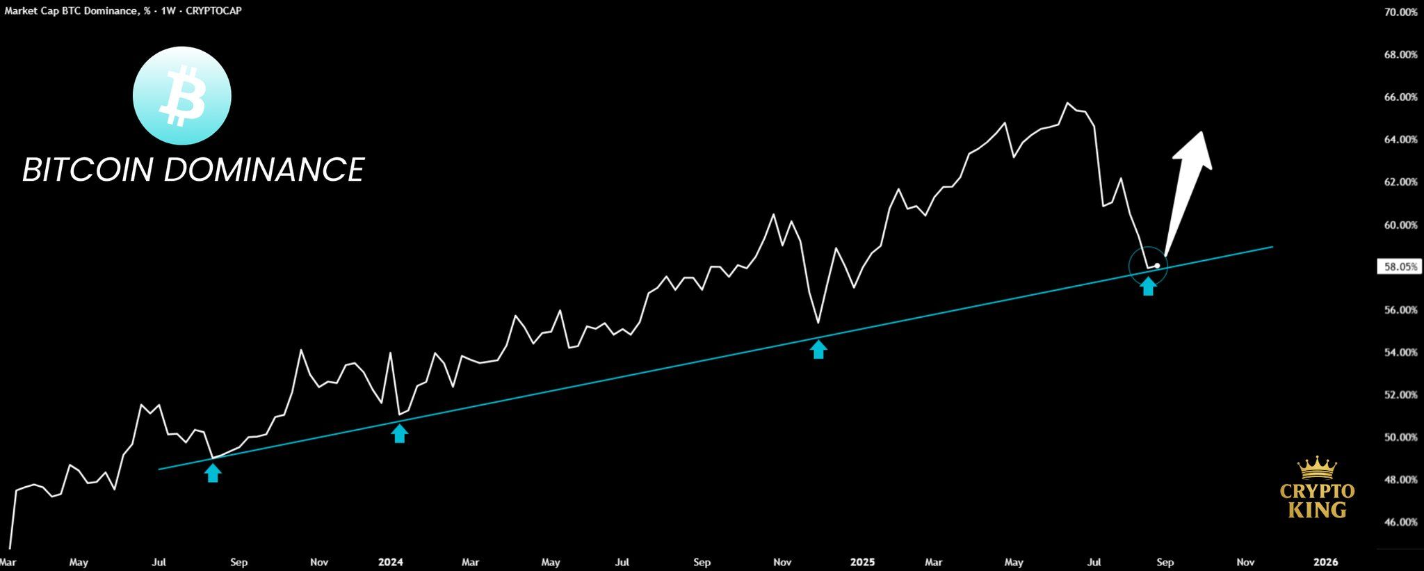 Buna ek olarak, tanınmış analist Crypto King, X platformunda Bitcoin dominansının Eylül ayında istikrar kazanabileceğini ve hatta toparlanabileceğini belirtti. Eğer bu gerçekleşirse, bir altcoin sezonunun patlak verme olasılığının azalacağını öngördü.