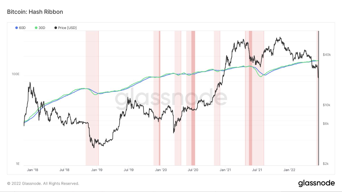 Hash Ribbons, madenci kapitalizasyonunun ne zaman gerçekleştiğini belirlemek için 30 günlük ve 60 günlük hash oranının hareketli ortalamasını kullanır. Yükselen 30 günlük 60 günün üzerine çıktığında, madencilerin işe dönmesiyle “en kötünün” bittiği varsayılabilir. Ancak şimdiye kadar, bu geçiş henüz gerçekleşmedi, bu durum maksimum acının ileri tarihlere uzanabileceği anlamına geliyor.