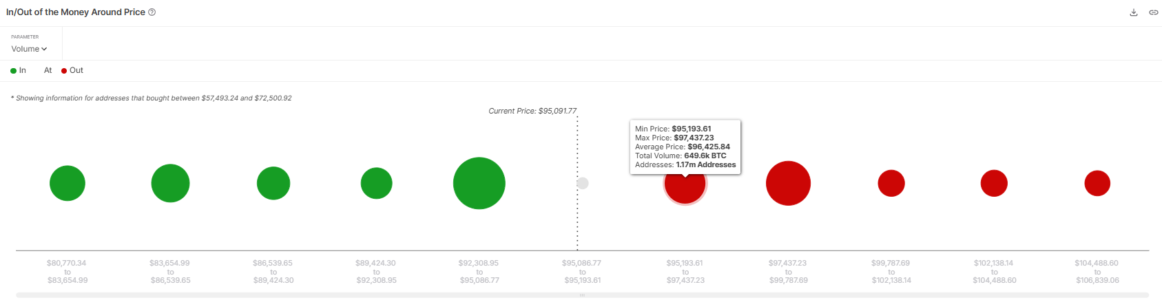 Bitcoin’in genel makro momentumu da yatırımcılardan gelen güçlü talep ile destekleniyor. IOMAP (Fiyat Çevresinde Kârda/Zararda) verilerine göre, yaklaşık 649.600 BTC, 95.193 Dolar ile 97.437 Dolar arasında satın alındı ve bu da 61,6 milyar Doların üzerinde bir değere sahip. Yatırımcılar tarafından yapılan bu büyük birikim, Bitcoin için sağlam bir destek seviyesi oluşturuyor, eğer BTC sahipleri hemen satmak yerine ellerinde tutarlarsa. Açgözlülük bu yatırımcıları hemen satmak yerine tutmaya yönlendirirse, BTC daha da yükselebilir.