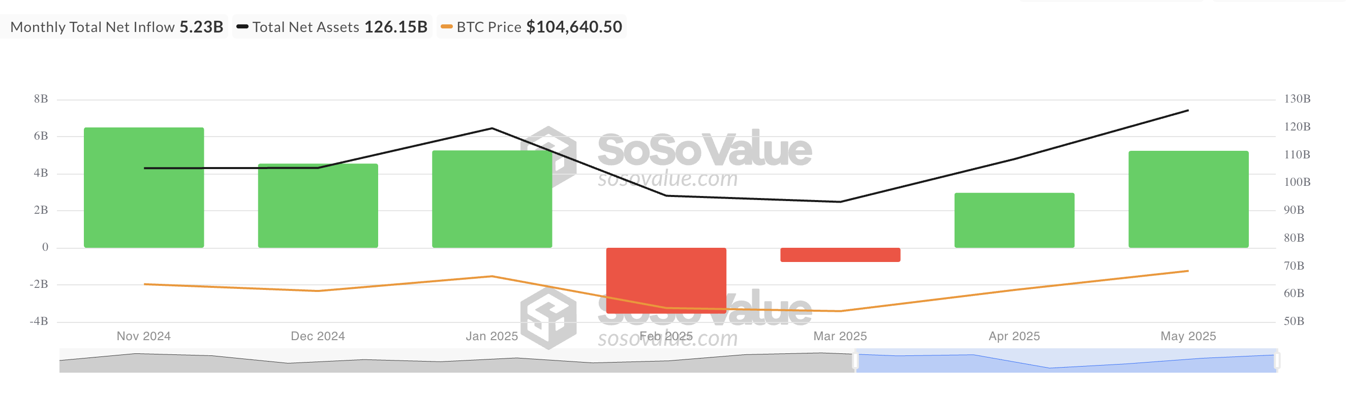 SosoValue verilerine göre, BTC ETF’leri Mayıs ayında talepte bir canlanma yaşadı ve net girişler 5,23 milyar Dolar’a ulaştı. Bu, Nisan ayındaki 2,97 milyar Dolar rakamına göre %76’lık bir artışa işaret ediyor ve Ocak ayından bu yana en büyük aylık giriş oldu.