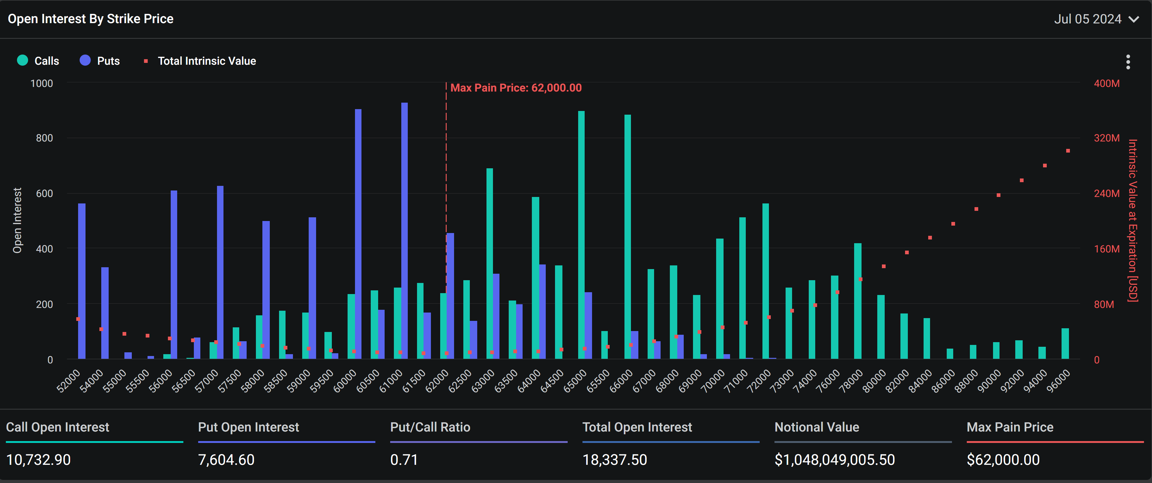 Vadesi dolan Bitcoin opsiyonlarının nominal değeri 1,04 milyar dolar olup, 18.339 kontrat vadesini dolduracak. Bu kontratlar, 0,71’lik bir put-call oranına ve 62.000 dolarlık bir maksimum acı noktasına sahip.