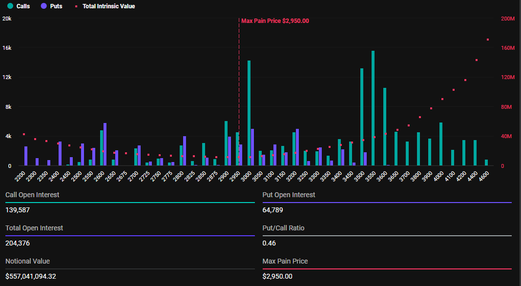 Bitcoin opsiyonlarına ek olarak, bugün 204.376 Ethereum opsiyon sözleşmesi sona erecek. Bu opsiyonların nominal değeri 557,04 milyon Dolar, put-to-call oranı 0,46 ve maksimum acı noktası 2.950 Dolar.