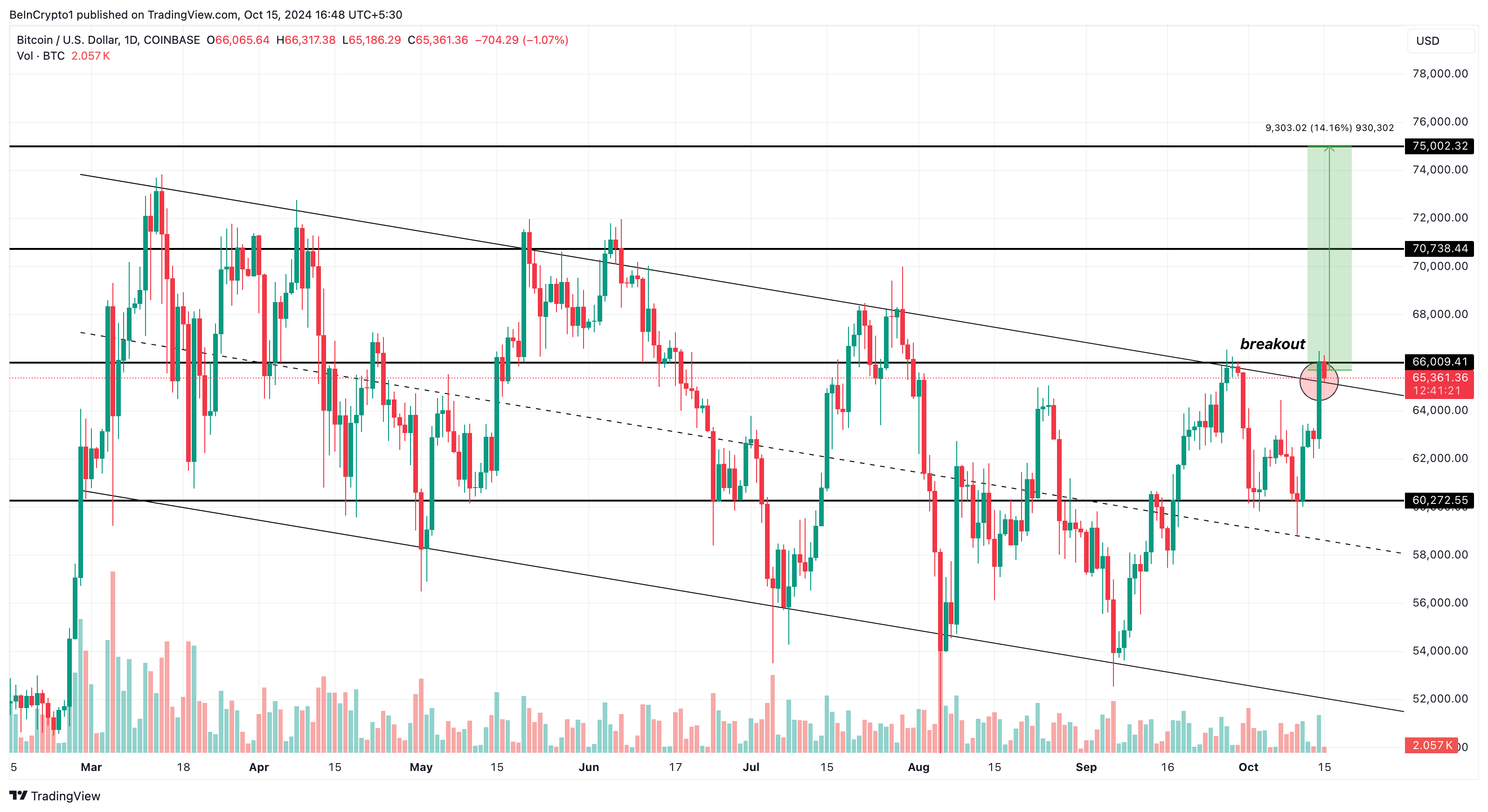 Ancak dün, 14 Ekim’de, BTC nihayet 65.234 dolarlık direnci aştı. Bu süreçte, coin kısa süreliğine 66.474 dolara çıktı ancak sonrasında geri çekildi. Buna rağmen, BTC düşen kanala yeniden girmekten kaçındı, bu da boğa tezinin hala güçlü olabileceğini gösteriyor.