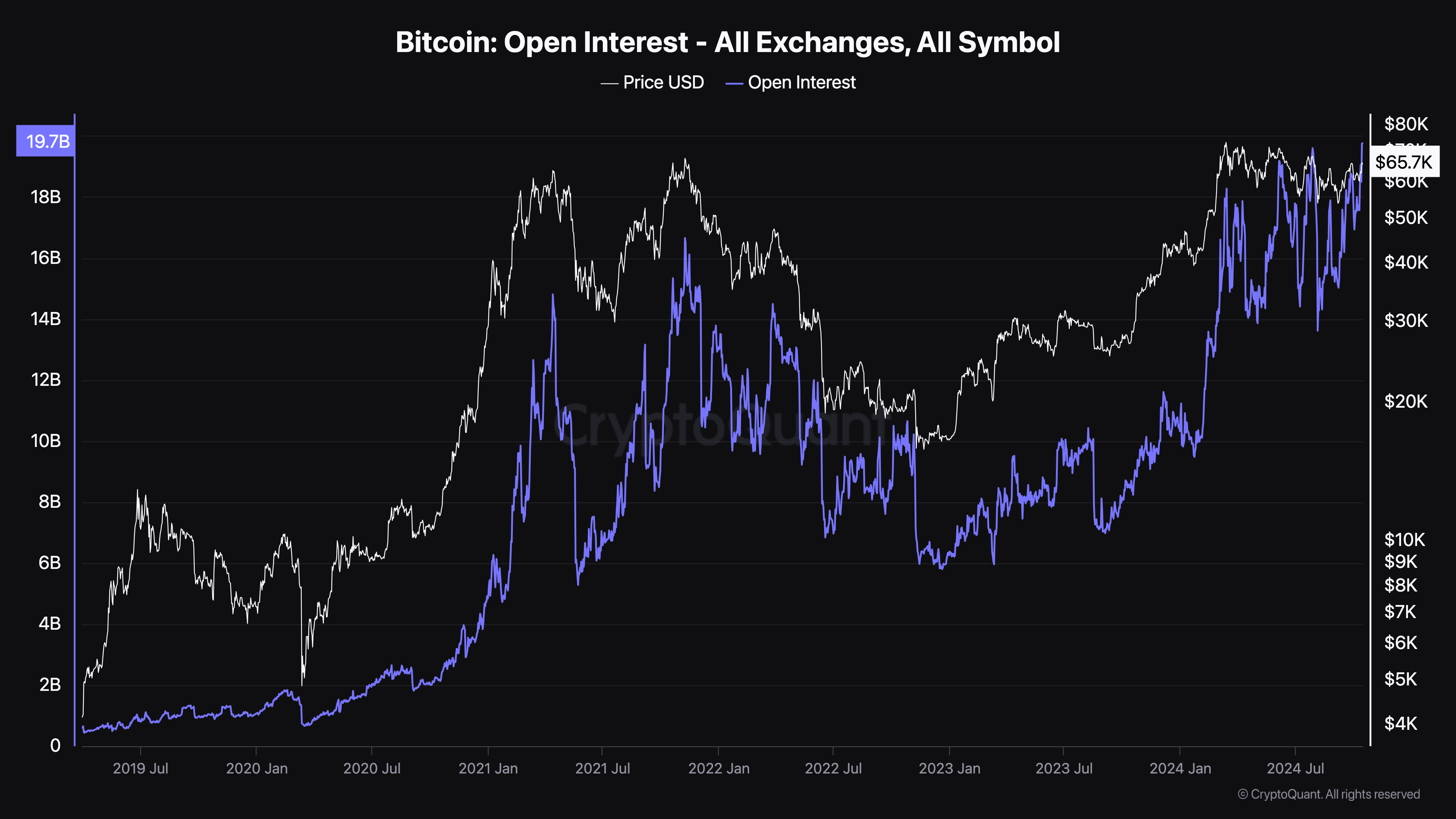CryptoQuant’a göre, Bitcoin’in Açık İlgi yeni bir tüm zamanların en yüksek seviyesine ulaşarak 19,80 milyar dolar oldu. Bu metrik en son Temmuz ayında bu kadar yüksekti. O dönemde, coin’in fiyatı neredeyse 68.000 dolara tekrar yaklaştı.
