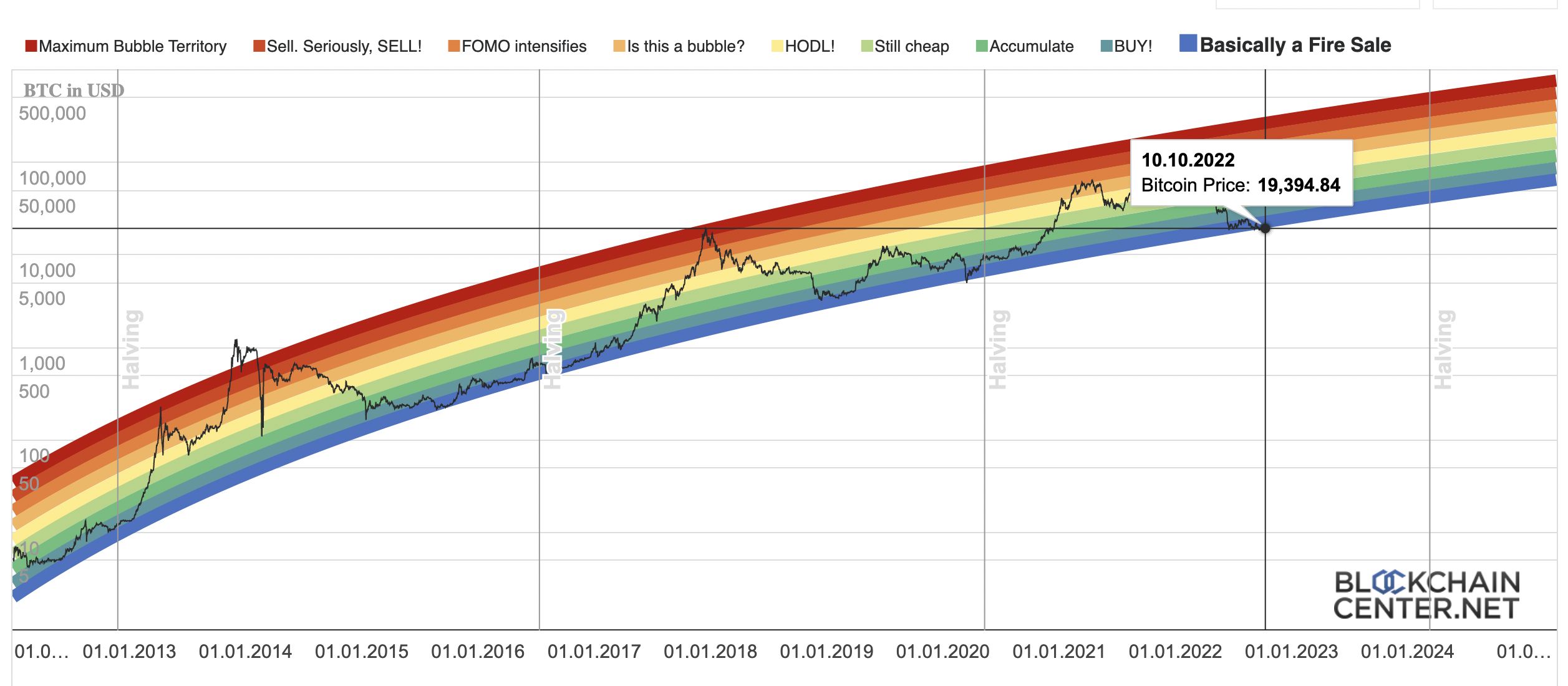 Bitcoin’in uzun dönem fiyatına bakmak için kullanılan en eski araçlardan biri olan BTC gökkuşağı grafiği, eğlenceli grafik görseli ile biliniyor. Grafik, yatırımcıların farklı fiyat aralıklarında ne zaman alış veya satış yapacaklarına işaret edebilen piyasa duyarlılığını renkli bantlarla göstermesinden dolayı gökkuşağı olarak adlandırılıyor. Kripto para grafiğine göre, BTC şu anda gökkuşağının en altında yer alan mavi bölgede ve dip seviyeye ulaşmış durumda.