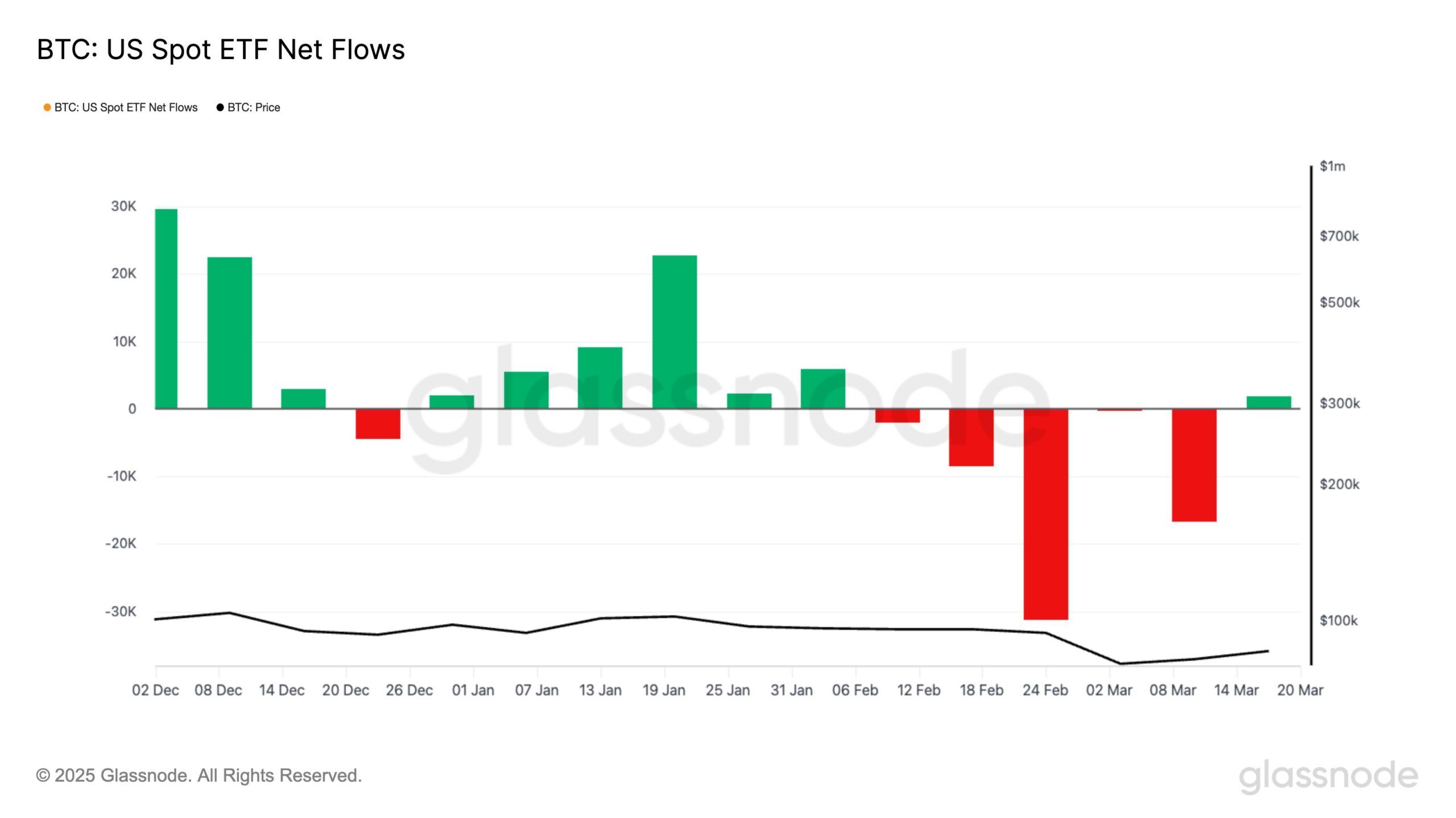 Bitcoin, özellikle Bitcoin Spot ETF’lerine son dönemdeki girişlerle makro momentumda da olumlu bir değişim gördü. Geçen hafta, bir ay içindeki ilk ETF girişleri gerçekleşti ve dört haftalık çıkış serisini kırdı. Bu değişim, özellikle makro finansal yatırımcılar arasında geri dönen bir güveni işaret ediyor. BTC ETF’lerine olan yenilenen ilgi, kurumsal portföylerde Bitcoin maruziyeti için artan talebi yansıtıyor.