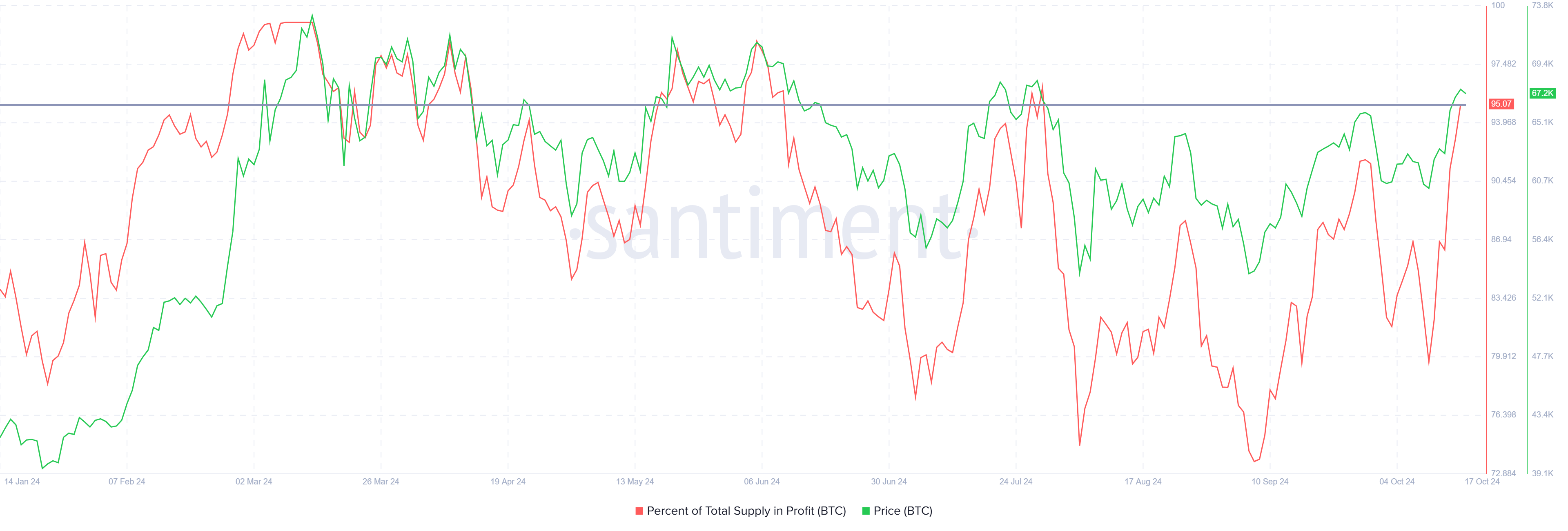 Bitcoin’in makro momentumu benzer şekilde dikkatli bir tablo çiziyor. Şu anda, Bitcoin’in dolaşımdaki arzının %95’i kar içinde, bu istatistik tarihsel olarak piyasa zirveleriyle örtüşüyor.