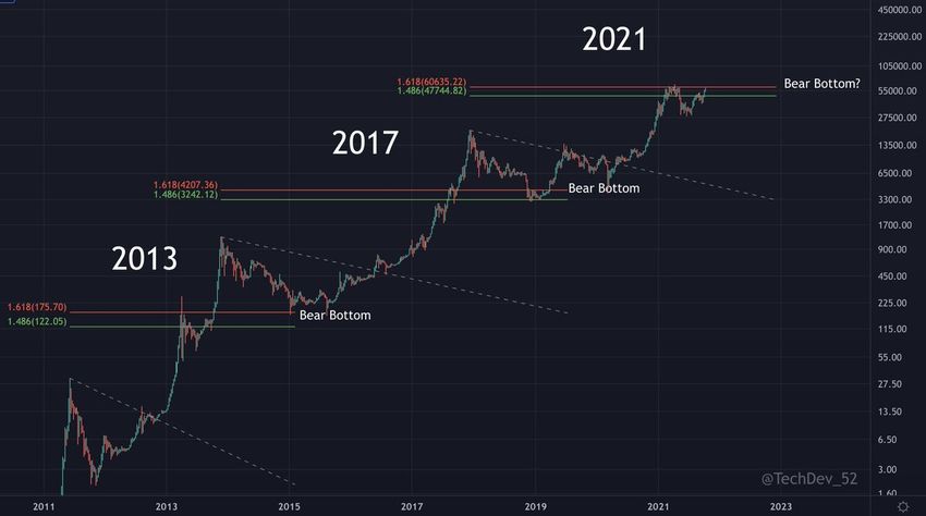 Bu seviyeyi belirlemek için TechDev yine Bitcoin’in tarihsel fraktalını kullanıyor. Her döngünün mutlak zirvesinden mutlak dibe kadar ölçüm yapan logaritmik bir BTC grafiği üzerine uzun vadeli bir Fib düzeltme seviyesi yerleştiriliyor.