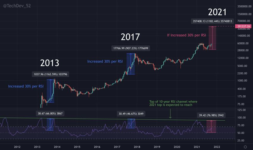 İkinci grafik ise daha da yukarı yönlü bir tahmin sağlıyor. Bu grafik, iki haftalık RSI’ye dayalı olarak Bitcoin’in potansiyel fraktal yükselişinin bir analizini gösteriyor. TechDev, 2013 ve 2017’nin önceki boğa piyasalarının her ikisinde de “döngü ortası düşüşünden sonraki hareketin iki haftada bir RSI başına %30 hareket ettiğine” dikkat çekiyor.