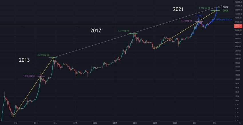 İlginç bir şekilde, altın fraktalına dayalı Bitcoin fiyat tahmini, boğa piyasasının zirvesi için yukarıda gösterilen aralıklarda kalıyor.