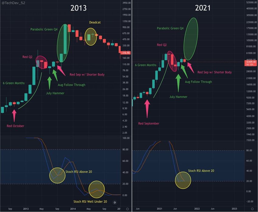 TechDev tarafından yayınlanan ilk grafik, aylık BTC grafiğinin fraktal yapısına bakıyor. Grafikte, 2013 boğa piyasasındaki fiyat hareketini mevcut 2021 rallisiyle karşılaştırıyor. Bu ikisi için,hem birbirleriyle uyumları hem de şekillerini karşılaştırırken, aylık mumların çok benzer olduğu ortaya çıkıyor.