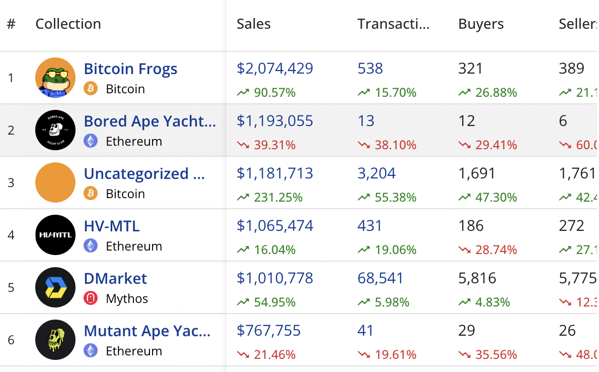 Bitcoin Frogs NFT’leri ticaret hacmi ile zirveye oturdu. BAYC NFT’leri gerileme kaydederken Bitcoin ağının NFT koleksiyonu yoğun ilgi görüyor.