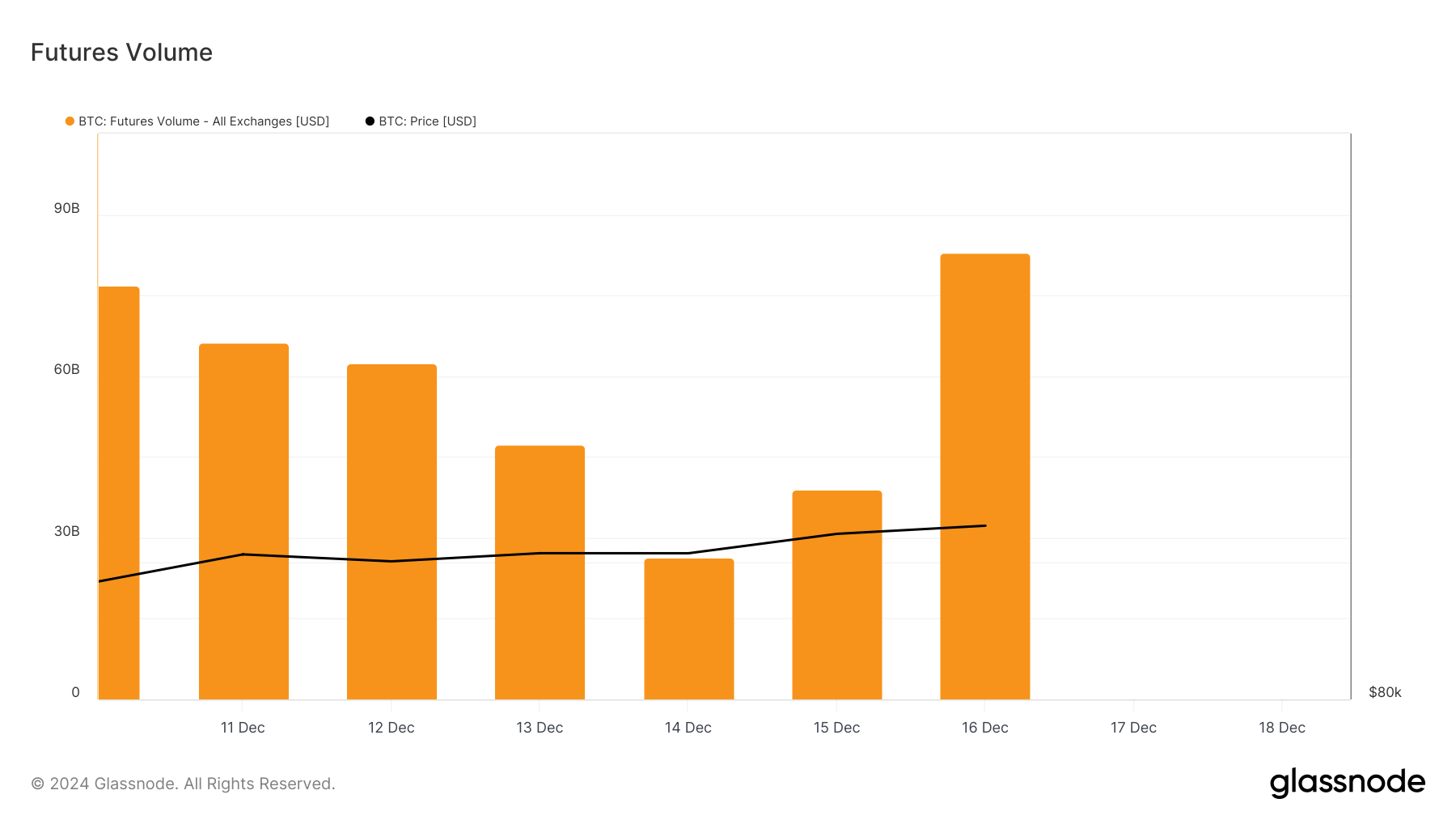 Geçen hafta Pazartesi günü, Bitcoin (BTC) vadeli işlem hacmi 90 milyar doların üzerindeydi ancak 10 Aralık ile 14 Aralık arasında istikrarlı bir şekilde düşerek geçen Pazar günü 26,39 milyar dolara ulaştı. Ancak, BTC’nin fiyatı yeni bir tüm zamanların en yüksek seviyesine ulaştığında, vadeli işlem hacmi de sıçrayarak 82,84 milyar dolarla yedi günlük zirveye ulaştı.