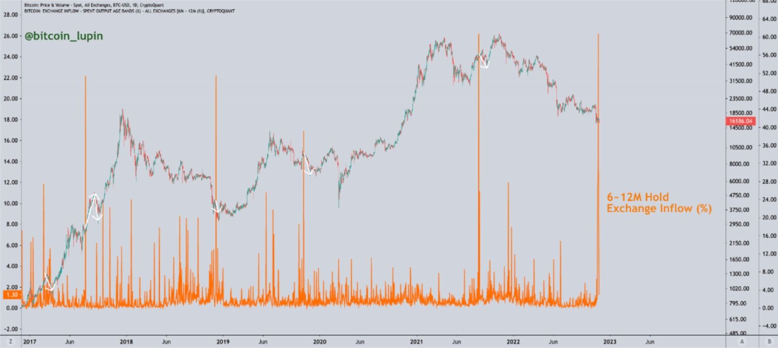FTX borsasının çöküşü kripto para sektöründe domino etkisi yaratıyor. İflas eden borsanın likidite krizinin ortaya çıkmasına paralel Bitcoin (BTC) fiyatı 15.500 dolara kadar geriledi. Öte yandan sert düşüş sonrası toparlanma görüldü. Ancak görülen fiyat hareketi ve veriler ise satış baskısının sürdüğüne işaret etti. Zincir üstü verilere göre, 6 ay ile 12 aylık BTC sahiplerinin Borsa Girişi payı son zamanlarda arttı.