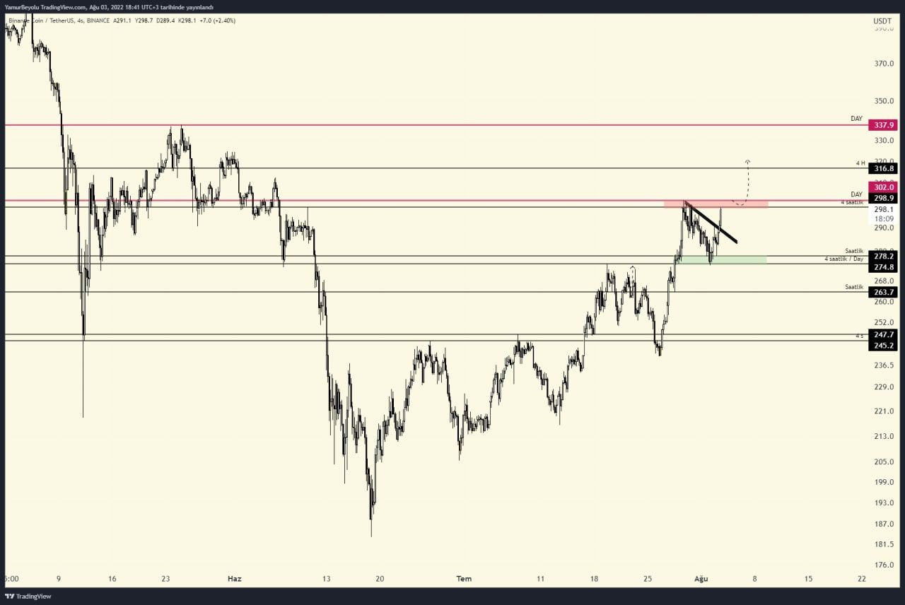 Bayoğlu, kısa vadede 275 dolar seviyelerinde kendine destek bulan altcoinin hızla yukarı yönde ivmelendiğine dikkat çekti ve 298 dolar seviyesinin önemi vurgu yaptı. Deneyimli analiste BNB bu seviye üzerinde kalıcı olmaya başlarsa yükselişini güçlendirebilir: