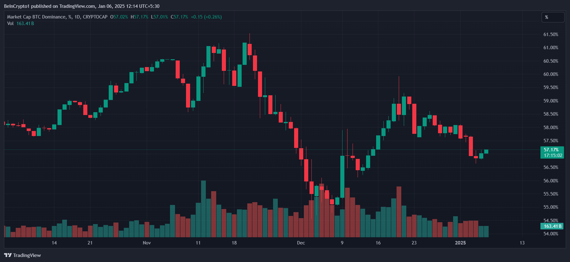 SponsoredBitcoin hakimiyeti üç hafta boyunca %53’e düştüğünde kısa bir süreliğine altcoin sezonu umutları doğdu. Ancak, bu düşüş kısa sürdü ve Bitcoin hakimiyeti hızla %58’e yaklaştı, 2024 sonlarında %55 civarında sabitlendi. Bu %55 seviyesindeki fiyat durgunluğu, Bitcoin’in piyasada sağlam bir şekilde kontrolü elinde tuttuğunu gösteriyor.