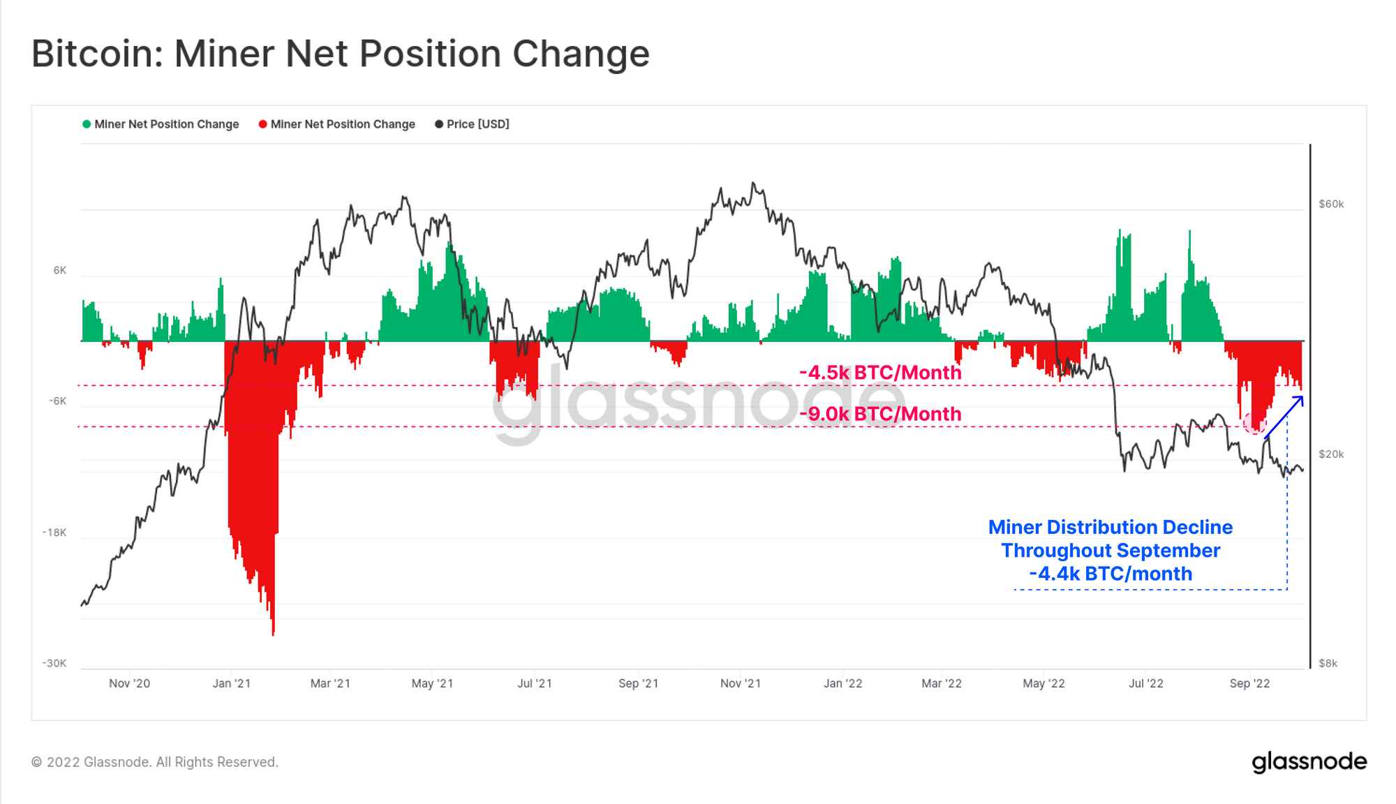 On-chain verileri, Bitcoin madencilerinin net pozisyon değişimi endeksinin son zamanlarda düştüğünü gösteriyor. Bitcoin satım ve birikimine dair madenci pozisyonlarını ortaya çıkaran bu metrik, geçtiğimiz aya göre %50’ye yakın düşüş gösterdi. Glassnode tarafından yayımlanan en son haftalık raporda “BTC madencilerinin geçtiğimiz ayın başında ayda 9.000 BTC sattıkları” belirtildi.