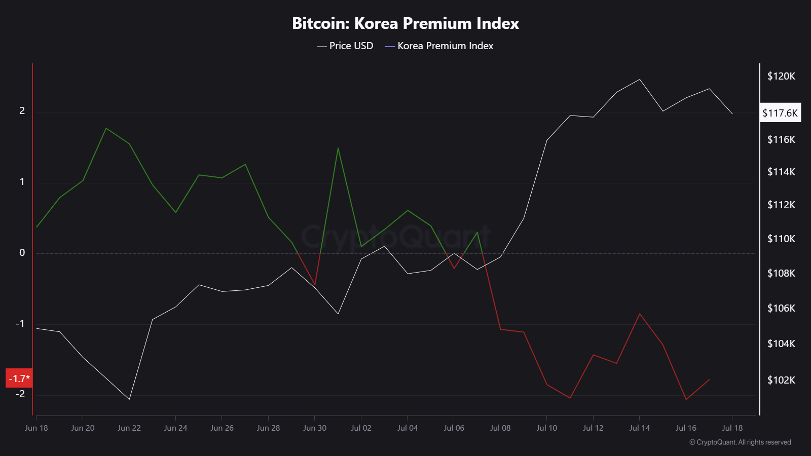 Buna keskin bir tezat olarak, Kore Primi Endeksi — genellikle “Kimchi Primi” olarak adlandırılır — sıfırın altına düştü.