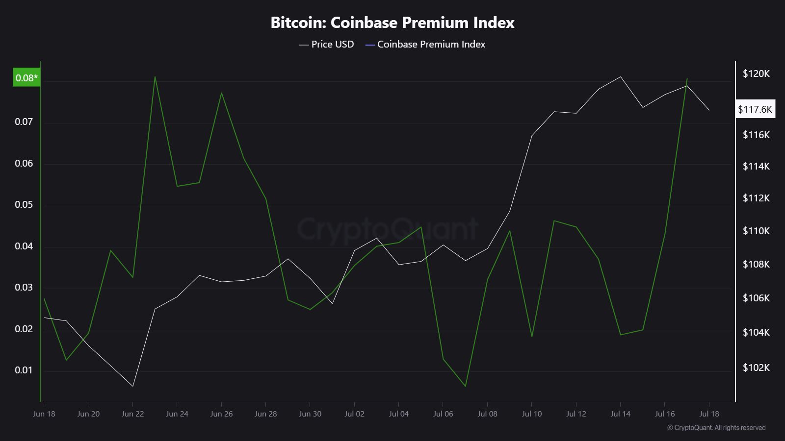 Coinbase Premium Endeksi, Coinbase (USD) ve Binance (USDT) üzerindeki Bitcoin fiyat farkını izler ve Temmuz ayı boyunca yükseldi.