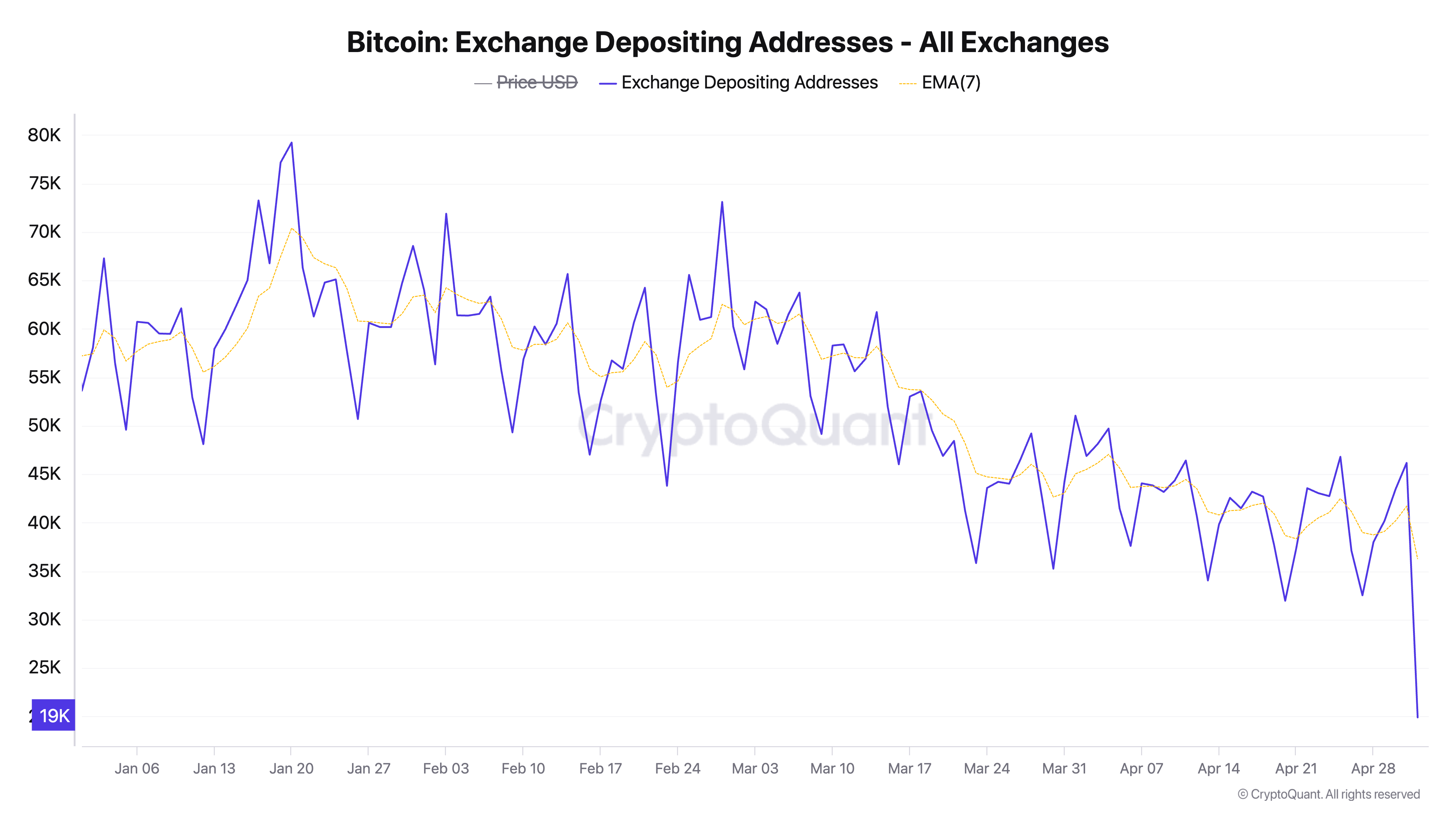 CryptoQuant’tan alınan zincir üstü verilere göre, BTC’yi kripto para borsalarına gönderen benzersiz cüzdan adreslerinin sayısı 2017’den bu yana en düşük seviyesine geriledi. Şu anda 19.282 adresle, geçen ay %60’tan fazla bir düşüş yaşandı.