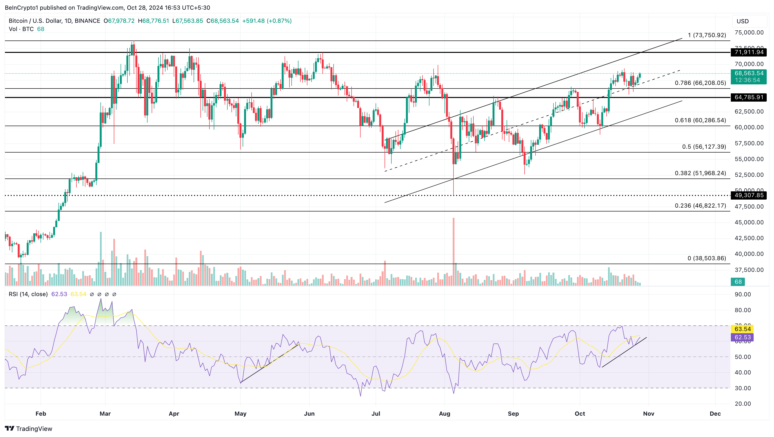 Günlük grafikte, Bitcoin $64,785 destek seviyesini koruyor. Bunun ötesinde, Göreceli Güç Endeksi (RSI) fiyatın $71,911’e yükseldiği gibi aynı trendi izliyor gibi görünüyor.