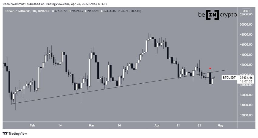 Bitcoin (BTC) 22 Ocak’ta yükselen bir destek çizgisini takip etmeye ve artış sergilemeye başladı. Ancak yükseliş hareketi, süreklilik kazanamadı. Böylece 22 Nisan’da destek çizgisinden kırılım gerçekleşti.